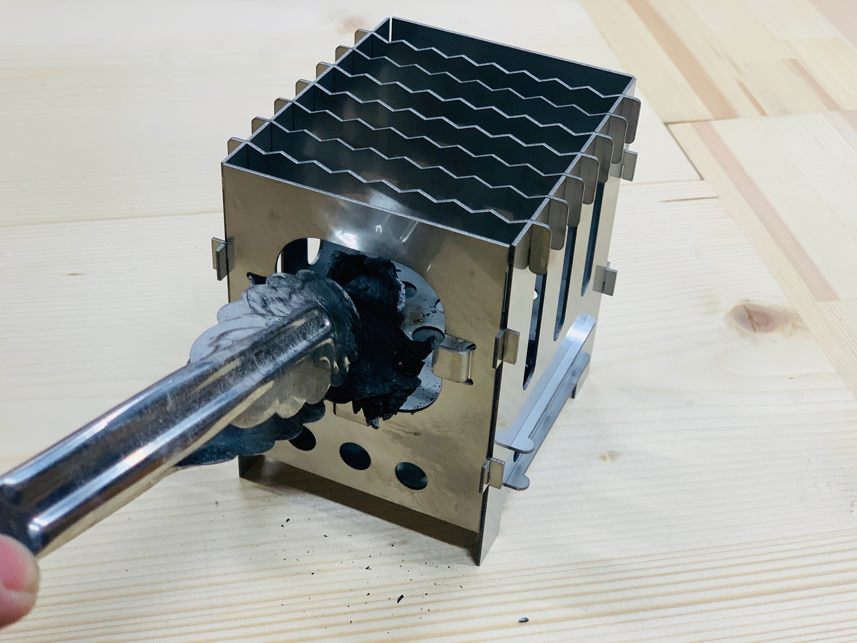 ②使用後に洗いやすく、持ち運びらくらく。収納も場所を選びません!③薪をくべるように炭をくべる、凝ったギミックがたまりません。