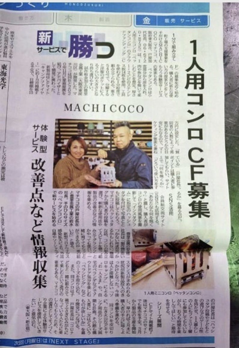 • 皆様、こんにちは。株式会社 MACHICOCO 代表の戸屋です。[ペッタンコにする新発想!1 分で組み立てるお一人様用ミニコンロ「ペッタンコンロ」]商品はお手元に無事届きましたでしょうか?ご支援頂きました皆様、応援くださった皆様、ありがとうございました。改めてお礼申し上 げます。★以前ご案内しておりました「ペッタンコミュニティ」は「マチトヨデザインワークス」 に名前を変更し 6 月よりスタートします!                   ●ペッタンコンロ誕生のきっかけ ペッタンコンロは昨年末頃に豊里金属工業の岩水社長が「これよくない?」と弊社に持ってこられた事がきっかけで商品化しました。これだけのクオリティで作ったのをここだけで終わらせるのはもったいない。そう思い、商品にしようと企画したことが経緯です。写真:ペッタンコンロ×産みの親、岩水社長    ●一緒に商品を「育てる」コミュニティがあったら面白い! 年末から商品化しようと話を進めてきましたが、さぁこれからという時に緊急事態宣言が発出されました。またステイホームを余儀なくされる事で孤独になる人が出てくる。何か私たちが力になれる事はないかと考え始めました。そして出てきた案が、ペッタンコンロを通じてみんながコミュニケーションを取れる場所を作るのはどうか?というものでした。一つの町工場から出てきたアイデア商品。この商品にはお客様のニーズやご意見がもっともっと反映されるべき。このペッタンコンロを使って頂く皆様と意見交換しながら一緒に商品をより良いものに育てていく。そんなコミュニティを作ると面白いのではないか、ペッタンコンロを通じて人と人が繋がるきっかけが作れるのではないか?そう考え、『ペッタンコミュニティ』を作ることになりました。                                               ●ペッタンコミュニティ→マチトヨデザインワークスへ進化!そしてクラウドファンディングにて皆様にご案内することに。クラウドファンディングの 期間中にこのコミュニティをお伝えしていたら様々なご意見を頂くようになりました。・ペッタンコンロだけではなく、商品作りやアイデアの意見交換できる場があるといい。・作りたいものがあってもどこに依頼して良いかわからないから相談できる場があるとい い。・町工場の職人さんに技術的な知識を教えてもらえるところがあるといい。このような意見を受け、岩水社長とも相談し、コミュニティの内容を考え直した結果、ペッ タンコンロにテーマを限定せず意見交換できる場にしようという話に。名前も「ペッタンコ ミュニティ」から「マチトヨデザインワークス」に変更することとなりました。そんなわけで...オープンを控えたマチトヨデザインワークスのご案内です♩ ~~~~~~~~~~~~~~~~~~~~~~~~~~~~~~~~~~~ 【マチトヨデザインワークス】 「町工場と一緒に創ろう!ものづくりのアイデア育成コミュニティ」                   限定公開 URLhttps://community.camp-fire.jp/projects/382410/preview?token=2ltur4eh~~~~~~~~~~~~~~~~~~~~~~~~~~~~~~~~~~~    ★コミュニティでできること★○ Facebook 非公開グループ「マチトヨデザインワークス」でものづくりのアイデアをシェアして意見交換できるコミュニティに参加し投稿、コメントできます!マチトヨからは面白い製造の事例や、それに関わる技術的なお役立ち情報を日々投稿します。コミュニティ メンバー限定イベントご案内も♩○ 材料や工法、工場への製造相談の仕方が学べる非公開ページで、材料の特徴や選び方に関する情報、工法について、工場に製造依頼する時に必要な情報や、量産までの進め方など...作りたい人に役立つ記事や動画を随時ご覧いただけます。○ マチトヨと ZOOM で話そう!オープン企画会議に毎月参加。コーディネーターの戸屋と、職人の岩水(イワミー)に直接質問できる月一の zoom 交流会にご参加いただけます。マチトヨデザインワークスでの第一弾のディスカッションテーマはもちろん「ペッタンコ ンロ」。リターンとしてお買い上げ頂きました皆様と意見交換をしていきたいと考えている次第です。コミュニティにご参加いただき一緒にペッタンコンロをもっとブラッシュアップさせていきたい!!そう思っているところです。 豊里金属工業は設計から製造まで提案できる企業。普段から当たり前のように開発案件をこなしています。そんな彼らだからこそ意見をどしどしぶつけていきたいと思います。私たち MACHICOCO はディレクターとして、皆さんのアイデアを未来に繋ぐ面白い企画をたくさん考え仕掛けていきます!皆様と新しいモノ、コトを創り出せる事を楽しみにしております。 マチトヨデザインワークス、ぜひ!ご参加くださいませ。    【マチトヨデザインワークス】 「町工場と一緒に創ろう!ものづくりのアイデア育成コミュニティ」                   限定公開 URLhttps://community.camp-fire.jp/projects/382410/preview?token=2ltur4eh もっと見る