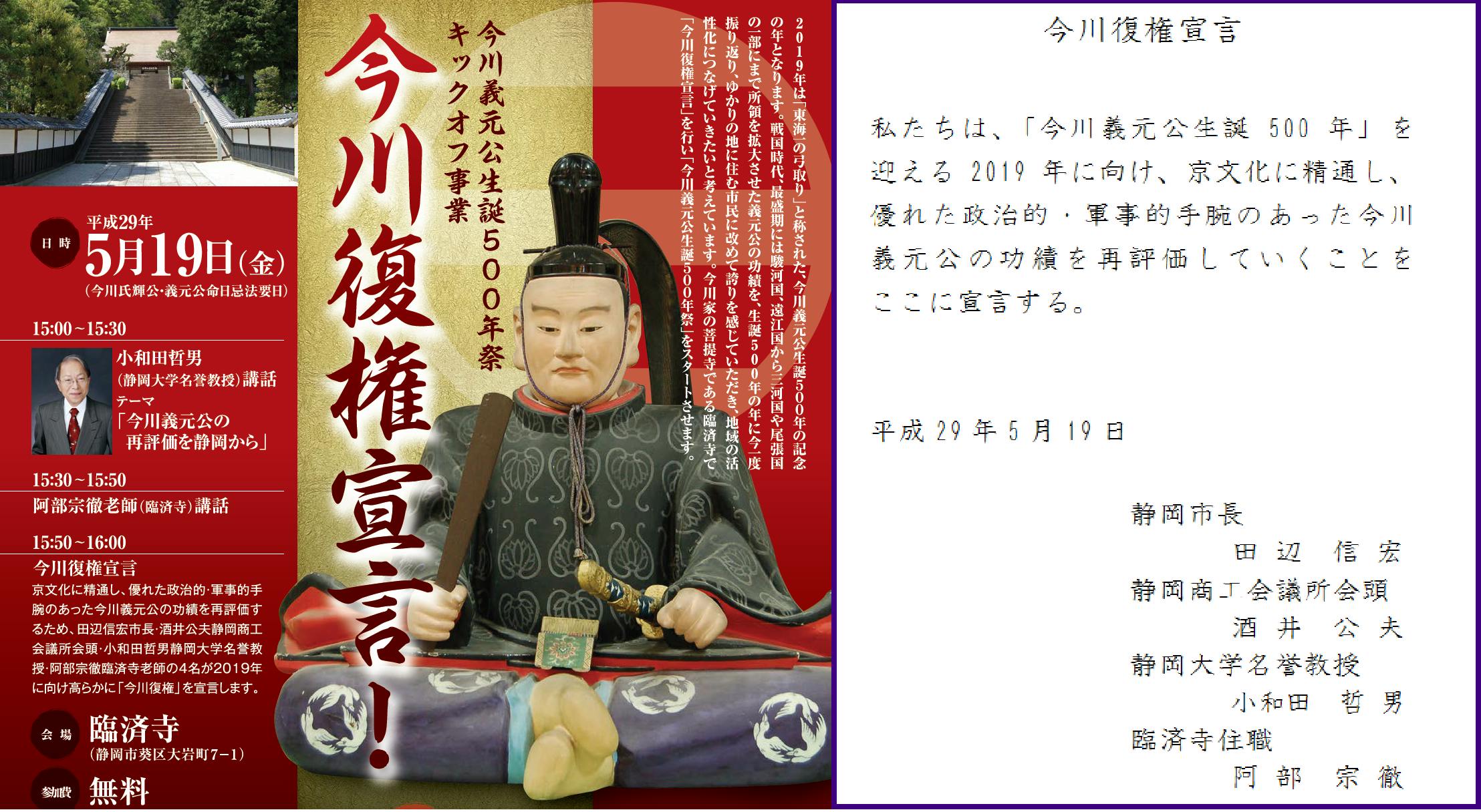 2年前の2017年5月19日、今川家の菩提寺である臨済寺において、今川義元公生誕500年祭キックオフ事業「今川復権宣言!」を開催しました。