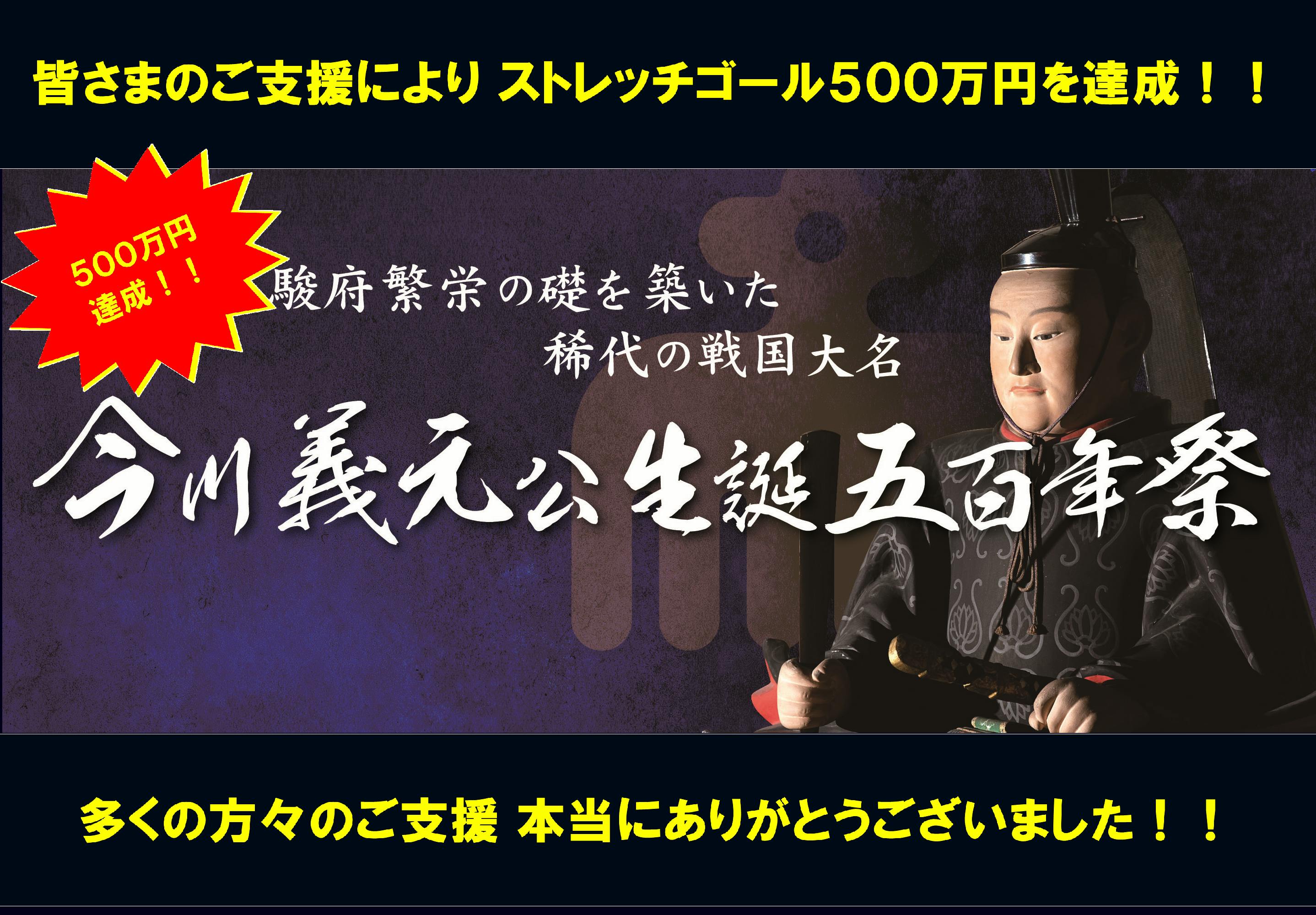 2019/10/11 08:0080日間にわたるクラウドファンディングが終了いたしました。目標金額を大きく上回る500万円超の支援と応援メッセージ、本当にありがとうございました!!ご支援いただいた方々から頂戴した応援メッセージを改めて見返してみると、このクラウドファンディング挑戦を通じ、今川義元公を深く知ってもらうきっかけになったのでは、と感じることができました。頂戴したメッセージの一例を紹介させていただきます。▶これを機に、もっと今川義元公について知りたいと思っています。▶今川氏好きとして、この度の銅像プロジェクトは本当に嬉しいです!▶竹千代を見守る義元公像。静岡の新しい観光スポットとなることを願っています。▶2015年の「今川さん」活動開始から4年経ちますが、今川義元公への再評価も、静岡での「今川さん」人気もひしひしと感じております。▶静岡市の小中学校で郷土史をしっかり教えて欲しいと思います。地元の歴史、文化を知ることで、この地に生まれたことを誇りに思う子どもが育てば、静岡市の未来も拓けます。▶ようやく今川義元公の銅像が建つのですね!待っていました!静岡に行くのが更に楽しみになりました(*’▽’*)▶義元の像が出来るとは30年前だったら考えられないことです。これも小和田先生の長年のご尽力の賜物だと思っております。<今後の予定>・リターン品はご案内通りのスケジュールでお届けできるように準備を進めております。・銅像設置については、順調に準備を進めております。2020年5月19日(予定)の除幕式を経て、JR静岡駅北口広場に今川義元公のシンボリックな銅像が姿を現します。近くへお越しの際は、ぜひ【皆さまと一緒に設置した今川義元公の銅像】を前に、記念撮影していただき、「#今川復権!」とSNSで拡げてみませんか!?今川義元公生誕500年祭推進委員会(静岡商工会議所) もっと見る