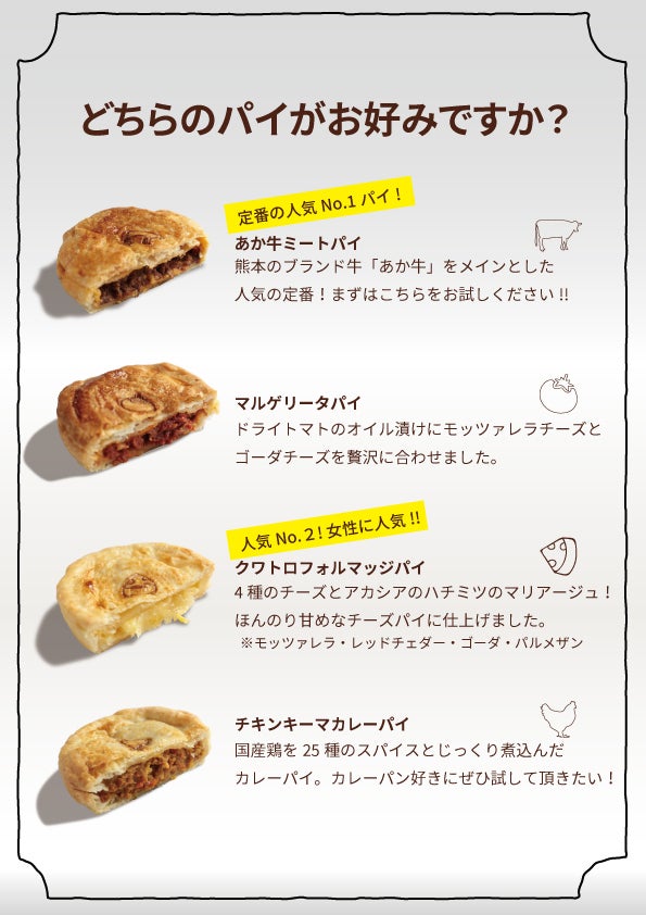 多くの方にセイボリーパイを知っていただきたいので熊本のお店にご来店いただける方用と、冷凍クール便でのお届け用とご用意致します。