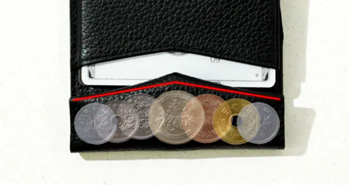 一般的な財布ではカードと小銭が重なり、またそれを収納するレザーが10枚~20枚重なることも。