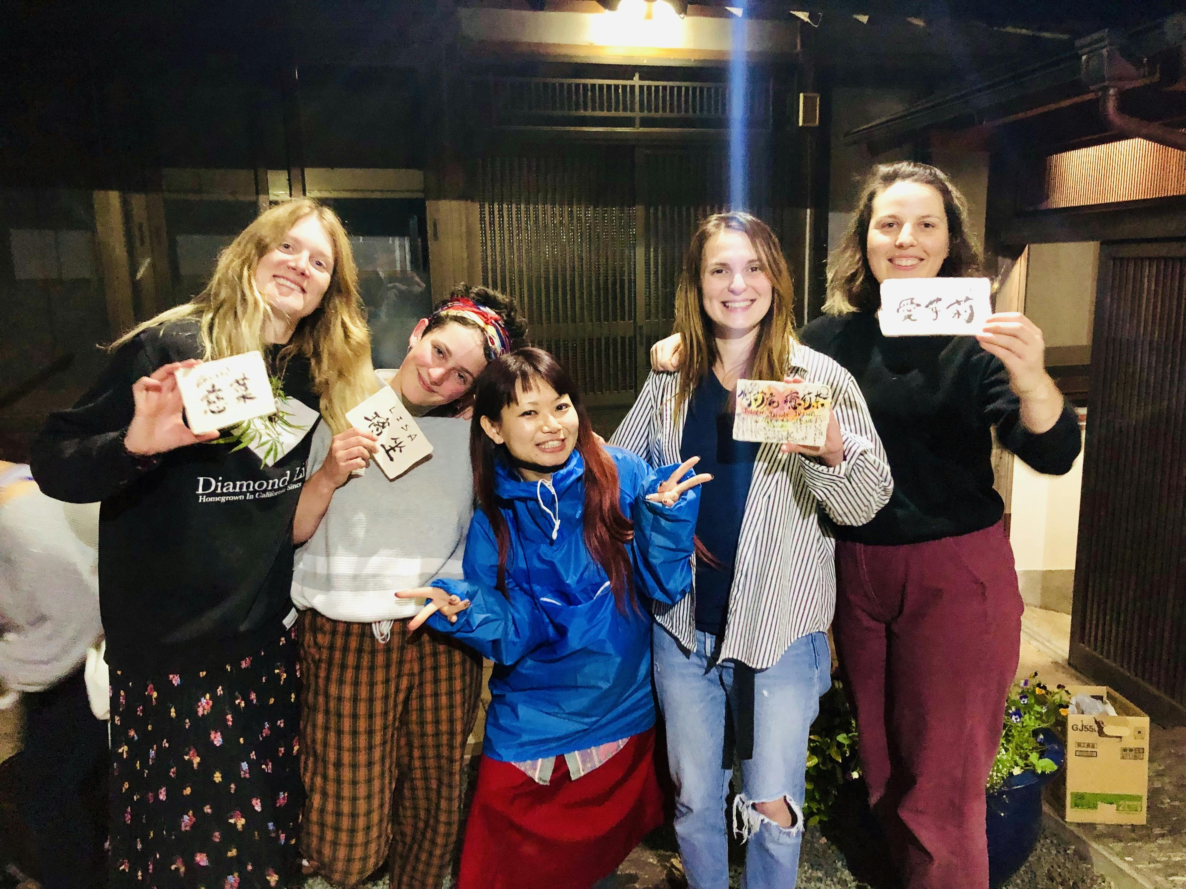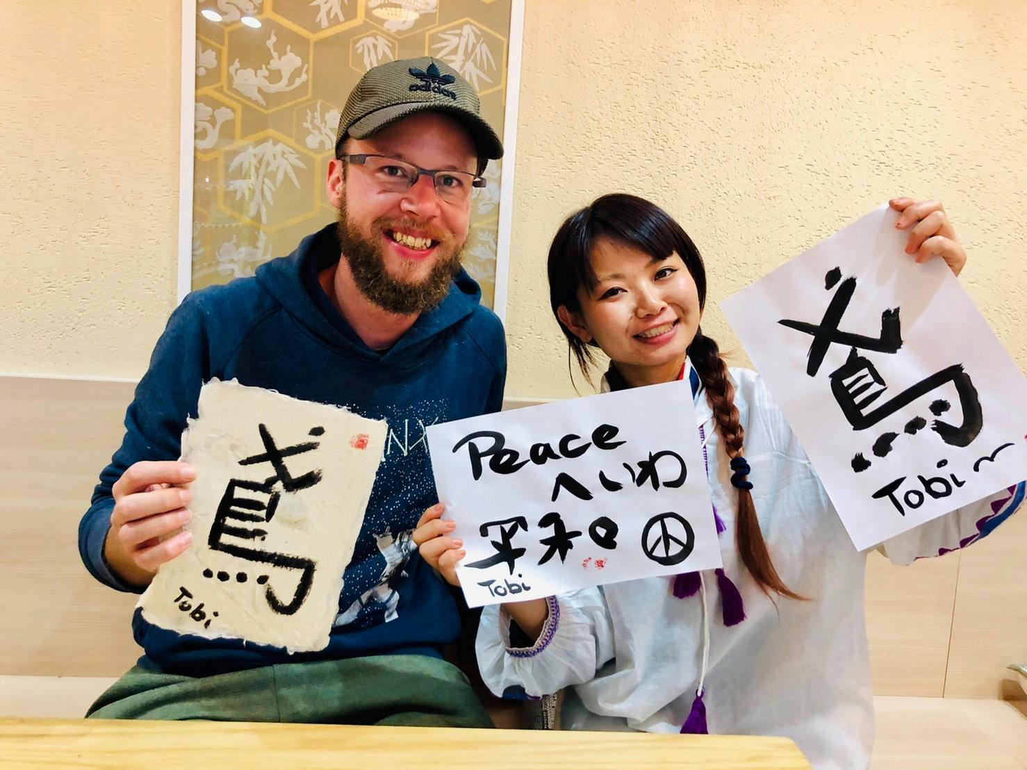 外国からの旅人に、「筆で書いてみる?」っていうと、ほんとに喜んでくれる。「やってみたい!」折角日本に来てくれてるんだから、自分でできることは体験させてあげたいやないですか。