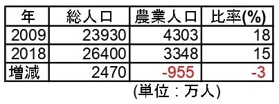 表は2009年と2018年を比較した全人口、農業人口とその割合です。この8年の間に農業人口は955万人減り、人口全体に占める割合も3%低下しています(表は西村作成)。