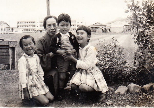 日南(1957年)。よく遊んだ近所の子たちと。後方の煙突は父の勤務していた製紙工場。