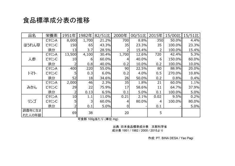 げんざい主流になっている栽培方法(農薬と化学肥料を使った慣行栽培)によって、野菜の栄養価はどんどん少なくなっています。それが私たちが自然栽培で野菜を作っている理由です。