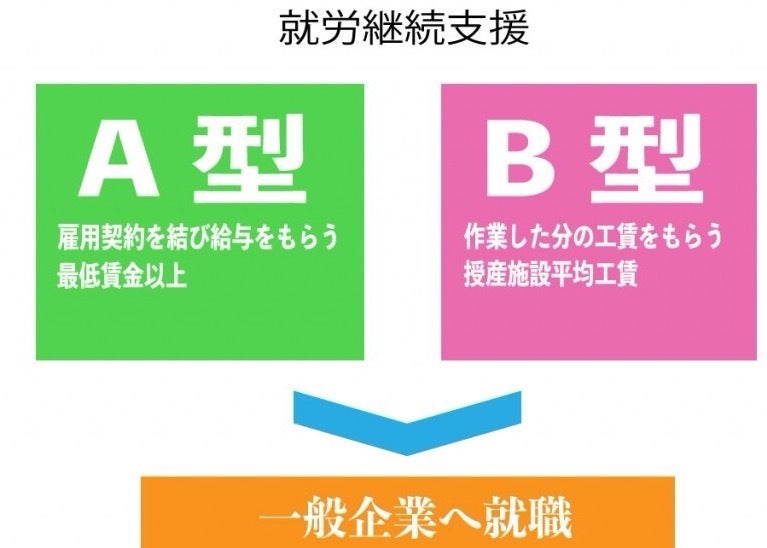 就労継続支援事業とは・・・通常の事業所に雇用されることが困難な障害者につき、就労の機会を提供するとともに、生産活動その他の活動の機会の提供を通じて、その知識及び能力の向上のために必要な訓練を行う事業の事。雇用契約を結び利用する「A型」と、雇用契約を結ばないで利用する「B型」の2種類があります。