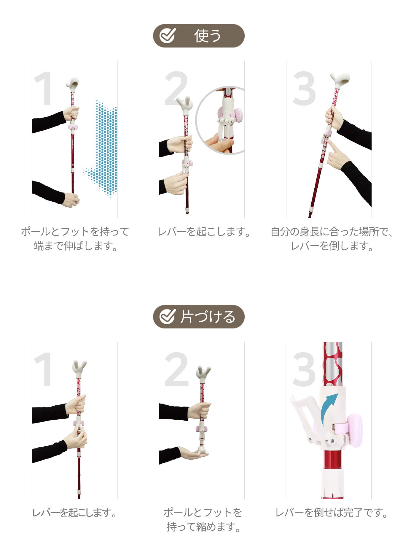 シャフトごとに緩めて締め直す作業が必要な低価格帯のポールと違い、レバー1つで4つのシャフトの長さを調節できる世界で1つしかない特許技術を適用した製品です。