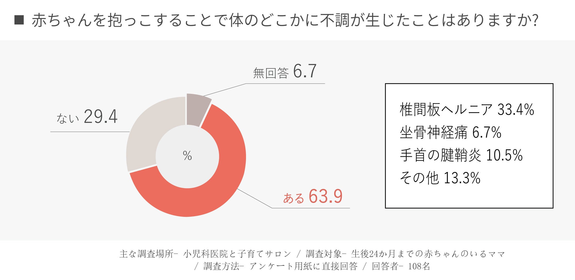 実際に6割以上のママが育児による体の不調を経験したことがあると答え、そのうち3割以上のママが、腰の病気にかかっていたことが判明しました。