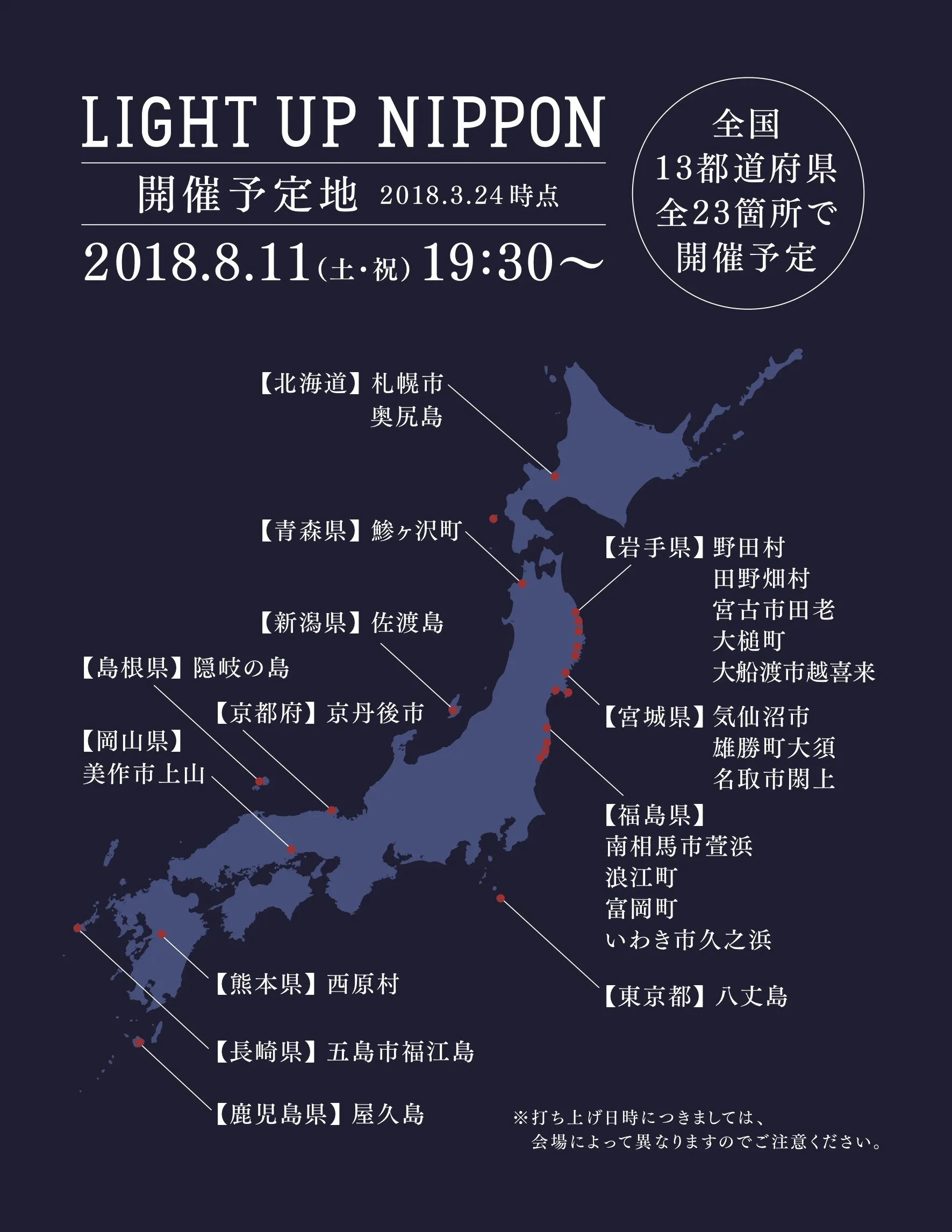 2019/08/26 10:13はじめに この度はLIGHT UP NIPPONが実施いたしましたクラウドファンディング『日本中を花火大会で元気にしたい!』へご支援をいただきましたこと、心より感謝申し上げます。 無事に今年の活動を終えられたことは、ひとえに皆さまの想いのおかげでございます。本活動報告の報告範囲 月命日にあたる8月11日19時30分から、東北3県と九州1県を中心とする会場にて坂本龍一氏の演奏する「赤とんぼ」に合わせて、『鎮魂と復興』の祈りを込めた花火を一斉に打ち上げた会場に関する事柄を、本活動報告の報告範囲とさせていただきます。実施概要イベント名称:LIGHT UP NIPPON 2019 全国一斉花火日時:2019年8月11日(日・祝)19時30分から内容: 月命日にあたる8月11日19時30分から、東北3県と九州1県を中心とする会場にて坂本龍一氏の演奏する「赤とんぼ」に合わせて、『鎮魂と復興』の祈りを込めた花火を一斉に打ち上げる。 また、東北3県と九州1県以外の会場ではこれらの趣旨に賛同し19時30分から21時までの間に『鎮魂と復興』の祈りを込めた花火を随時打ち上げる。主催:LIGHT UP NIPPON 実行委員会協賛:JT(日本たばこ産業株式会社)、三井不動産株式会社、東レ株式会社、JR東日本(東日本旅客鉄道株式会社)、JXTGホールディングス株式会社、鹿島建設株式会社、三井住友建設株式会社、コマツ(株式会社 小松製作所)、株式会社ミルコ、ANA(全日本空輸株式会社)、株式会社ASKプランニング、株式会社ベアレン醸造所、株式会社岩手くずまきワイン協力:お山デザイン後援:日本経済団体連合会、東北六県商工会議所連合会、東京商工会議所、TOKYO FM、岩手日報会場の様子【青森県 鯵ヶ沢】 鯵ヶ沢会場は、地元の実行委員会主催の「LIGHT UP NIPPON in あじがさわ」として開催されました。 心配していた台風が上陸することもなく、当日は30度に届かない気温、心地よい風が吹く中での開催となりました。 15時よりイベントがスタートし、地元の学生による三味線演奏や地域文化の保存会の方々による演舞が披露されました。 また、地域の特産品を使った露店が立ち並び、花火が始まるまでの間、心もお腹も満たし、LIGHT UP NIPPON が始まる19時30分に向けて待ちわびるお客様で賑わっておりました。 打ち上げを間もなく始める旨のアナウンスとともに、会場を照らしていた投光器を一気に消し、花火打ち上げの雰囲気を感じ取った来場者の皆様。 赤とんぼに合わせて、定刻の19時30分から花火が打ち上がり、曲に合わせて上がる花火に多くの歓声が挙げられておりました。 また、赤とんぼの曲が終了後、3分少々のインターバルを挟み、第2部の花火が打ち上げられました。 花火打ち上げの時間はトータルで15分少々という短い時間でしたが、打上げ終了後は来場者からの大歓声と拍手に包まれました。 来年度の実施へ向けてのお気持ち箱・感動箱を設置しておりましたが、多くの来場者から募金を頂くことができました。【岩手県 野田村】 野田村会場は、地元の実行委員会主催の「野田村三陸夢アートプロジェクト音楽祭」&花火大会「LIGHT UP NIPPON」として開催されました。 生憎の雨模様で風も強く肌寒い中での設営でしたが、時間が経つにつれて雨はあがり、グッズの購入や花火玉へメッセージを描きに来てくださる方々徐々にも増えて来ました。 ときおり濃い霧の中で咲いた花火は形こそ見えませんでしたがとても幻想的なものでした。 明るくなった空が周りを広く照らし、どんな花火が上がってるのだろうかと想像をかき立てられるようなものになりました。 ご来場者様からは、とても素晴らしかった、是非来年も続けて欲しいとお声がけを頂きました。【岩手県 田野畑村】 田野畑村会場は、地元の実行委員会主催の「島越子ども会夏祭り」として開催されました。 年々子供たちが少なくなってきているので、我々としては少し寂しさもあったが、その分顔を覚えている子達も多く、嬉しくなりました。 雨が降ったりやんだりの天気だった上に、開催かどうかを知る術もなく、集まりが芳しくなかったが、みな思い思いに空を見上げて、とても感慨深かったです。 風が弱かったので、花火が曇ってしまう場面が多かったが、その間から少しでも花火が顔を覗かせると、皆から「わぁっ」と歓声があがりました。 打ち上げ後の玩具花火は今年も盛況で、真剣に取り組む子、皆に火を分けて回る子など、いろいろな個性が見えて微笑ましかったです。【岩手県 宮古市田老】 宮古市田老会場は、地元の実行委員会主催の「LIGHT UP NIPPON おらほの復興花火大会8.11」として開催されました。 当日は朝から雨が降ったり止んだりの中で、15時ごろからお祭りが始まりました。 ステージが始まるとダンスや歌で盛り上がり、東京から来ている「僕らの夏休みプロジェクト(以下、僕夏)」の大学生や地元の子供達も集まりだして、一年振りの再会を楽しむ声も聞こえ賑やかになってきました。 小雨が降り続く中、地元の実行委員の挨拶や、LIGHT UP NIPPONの紹介の後、19時30