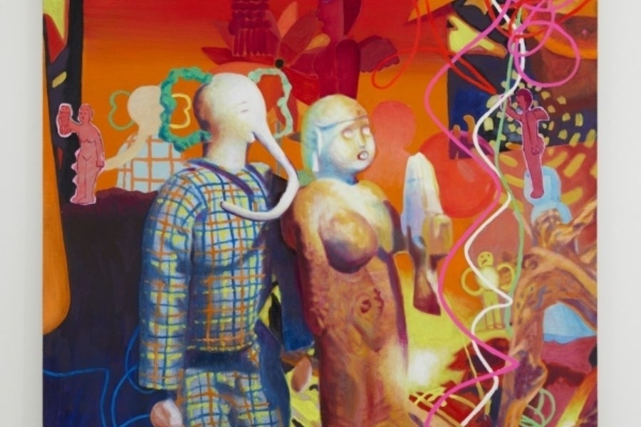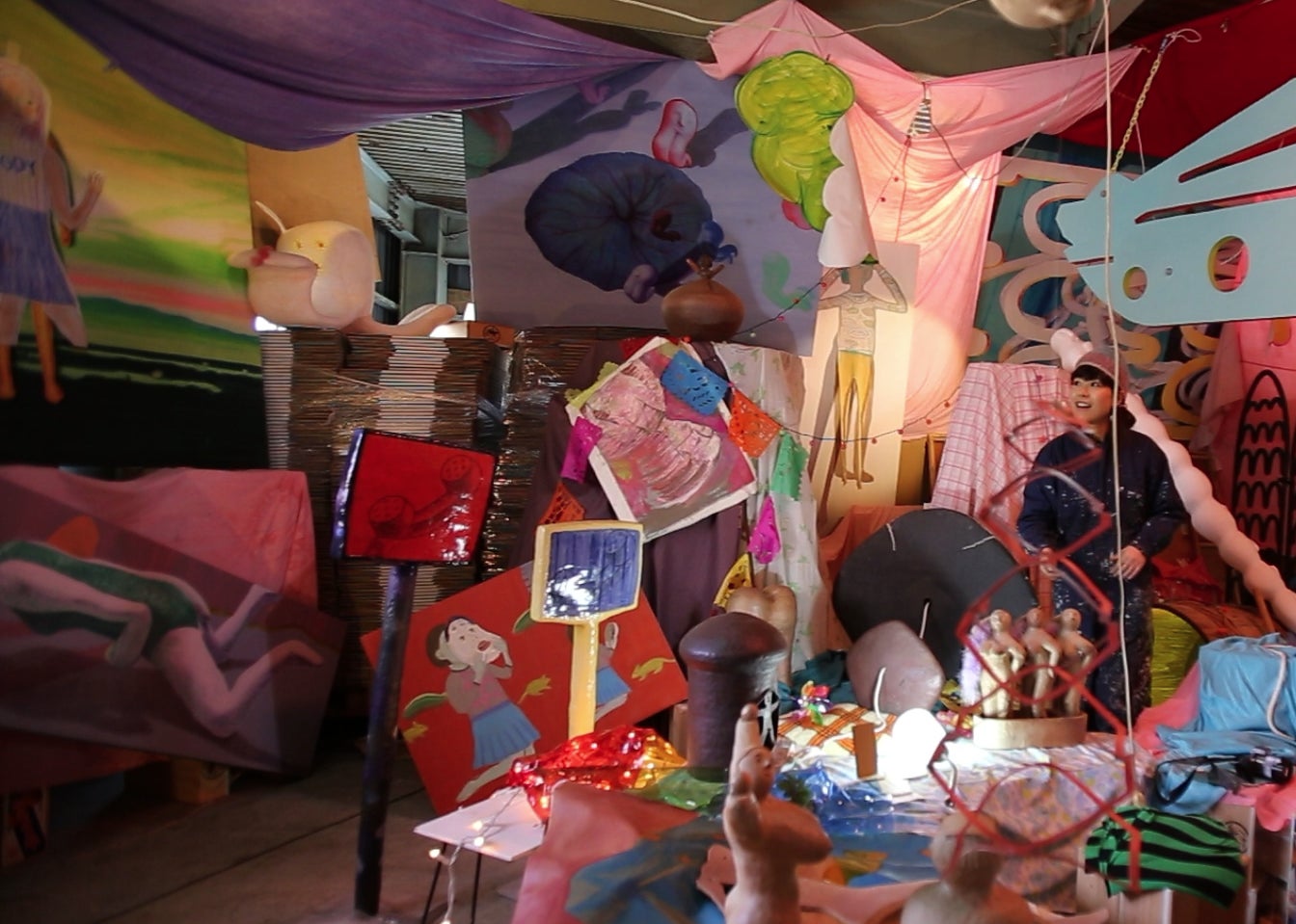 伊藤彩の絵画には、お化けや玩具のようなモチーフが登場しますが、それぞれが、空間がねじれたような不思議な奥行きの中にコラージュされています。彼女はまず、キャンバスのペインティングや紙のドローイング、立体物、布、家具などで実際のジオラマを作り、その作品世界に入り込んでいくのです。そして写真を撮影しながら、平面からは見えない構図や、アングルの視覚的効果を緻密に検討し、実際の絵画を制作していきます。この独特な制作プロセスこそが、中毒性をもって見るものを虜にする作品を生むのです。