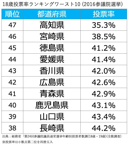 2016年7月の参議院選挙の10代の投票率は平均46%でした。