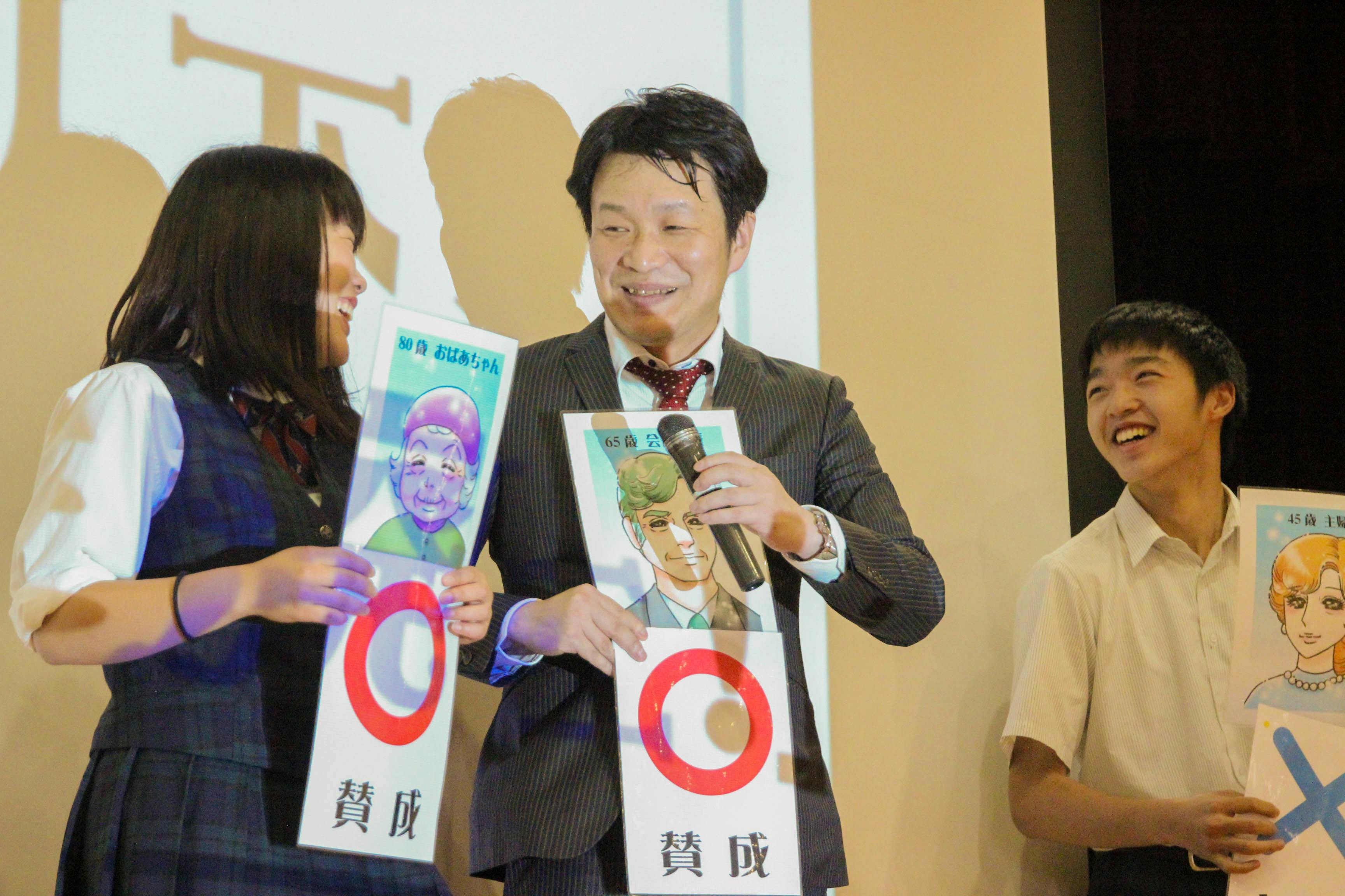 笑下村塾の授業では、芸人がお客さんの年齢層に合わせてネタを変えるのと同じように、政治家も投票率が高い年齢層に合わせて、重視する政策を変えるということを伝えています。