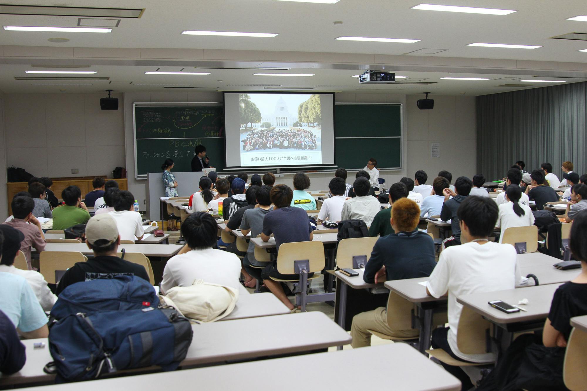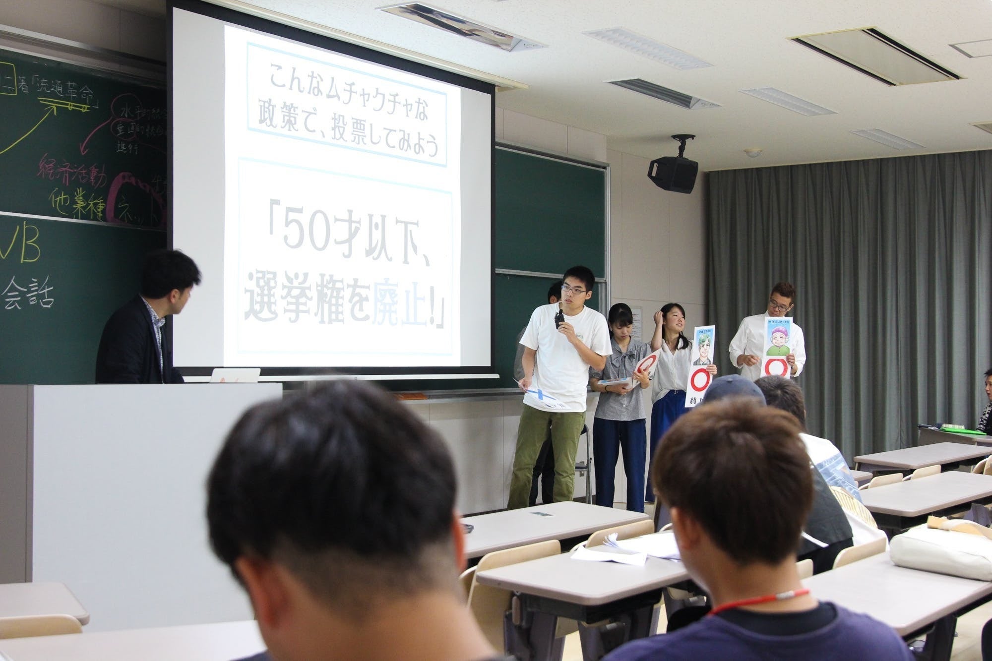 心配でしたが「笑える政治教育ショー」を始めた授業の後半では教室も埋まっていました!