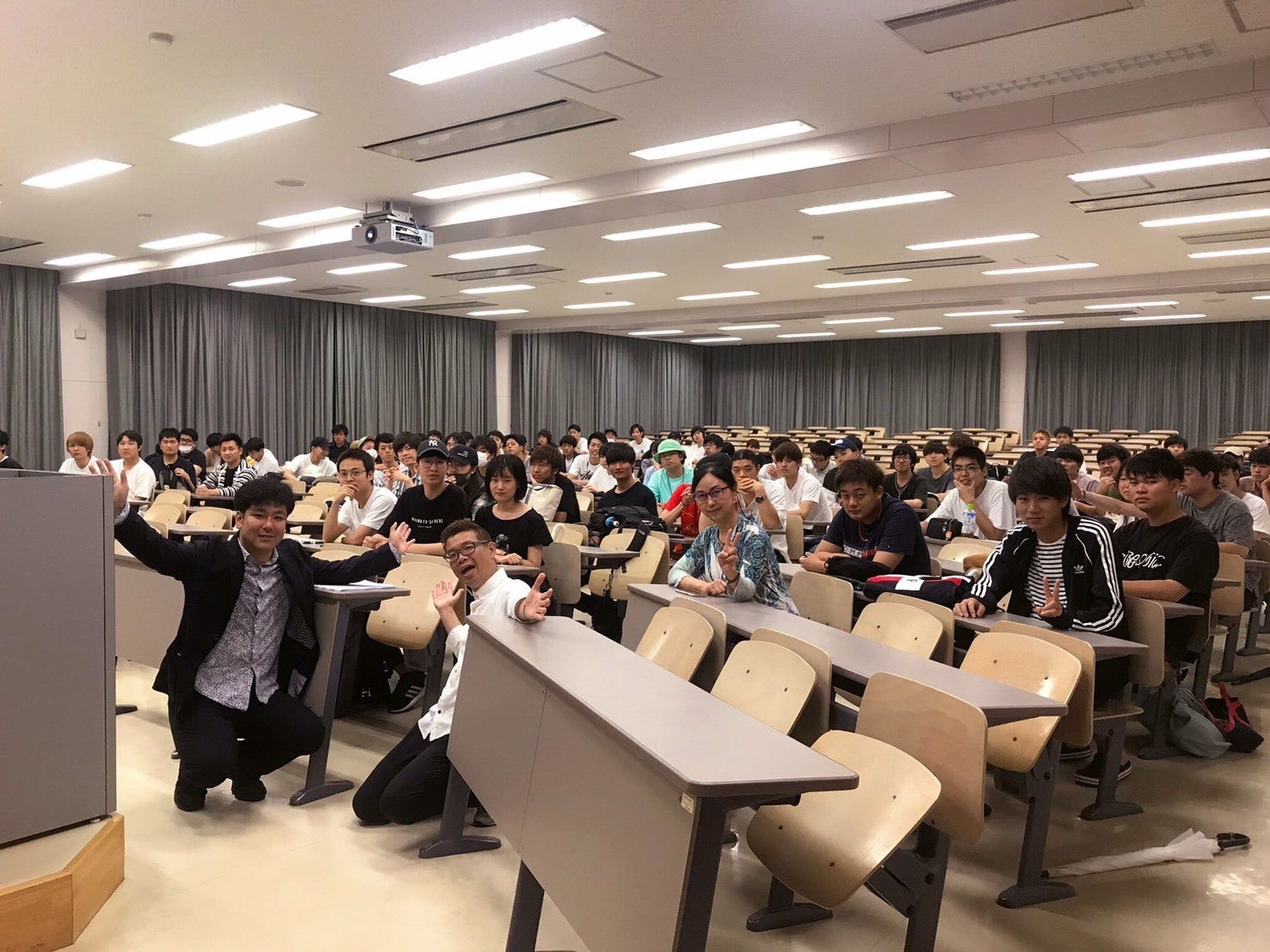 手前でピースしているのが、今回授業に招いてくださった康上先生です。