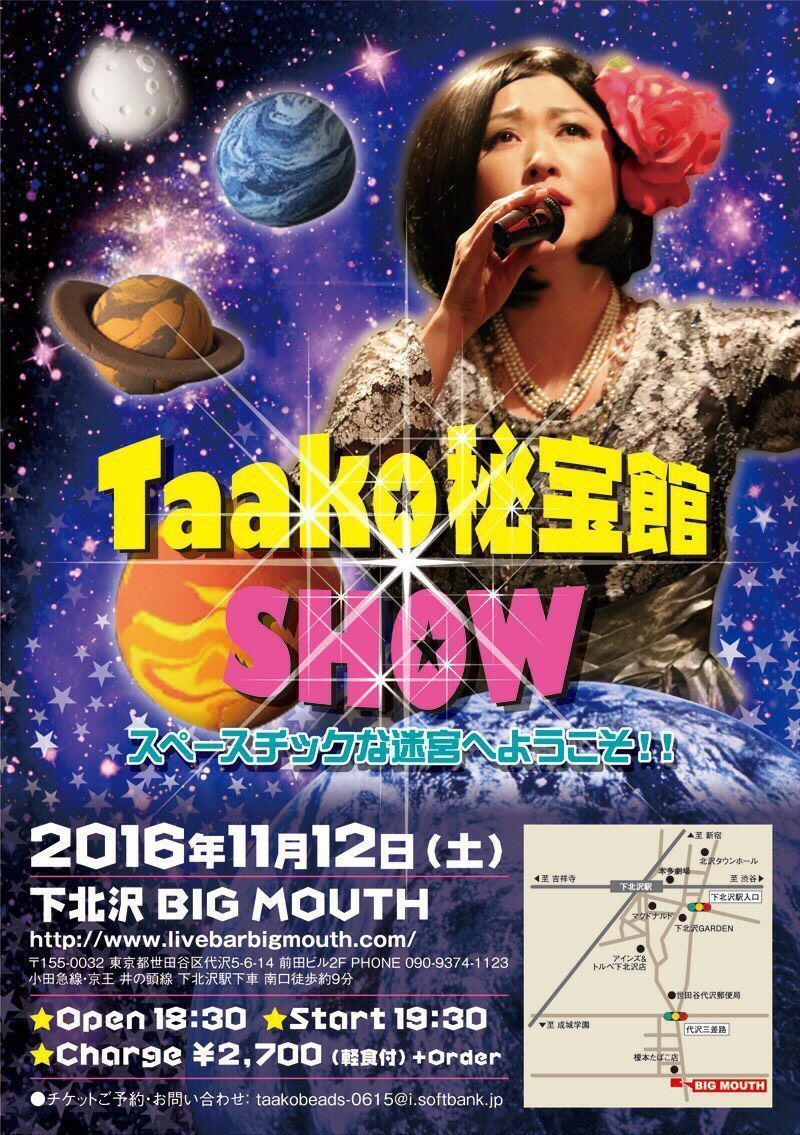 そして、いつしか〝Taako秘宝館〟と名乗るようになり、ライブの動員数も少しずつ増えてきて、活動開始から十年経った頃から、お客様から、「抱腹絶倒&前人未到のオリジナルな奇想天外の歌謡ショウ」とまで言われるようになりました。