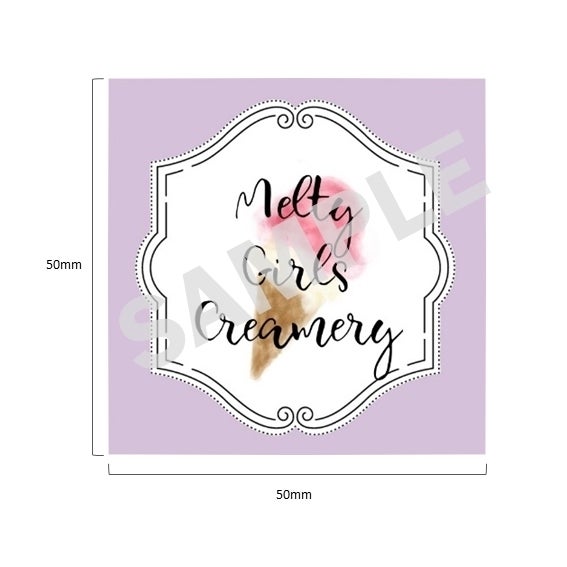 Melty Girls Creameryオリジナルロゴのデザインです。ストロベリーアイスとバニラアイスが今にもとろけだしそうなやさしいタッチのアイスクリームのイラストは、今回のための描き下ろしです。サイズは50mm×50mmで、使いやすいジャストサイズです!