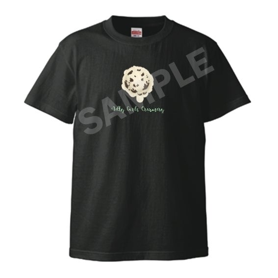 ダークカラー生地に、クッキーバニラ アイスの描き下ろしイラストと、さわやかなミントカラーでプロジェクト名を入れました。アイスクリームという可愛いモチーフで、性別問わず着こなしていただけるような、落ち着いたデザインを目指しました。デニムとの相性ばっちりで、黒ではないので下に黒も合わせられる、他にも色々な着回しができる便利なカラーです。サイズはS/M/L/XLからお選びいただけます。