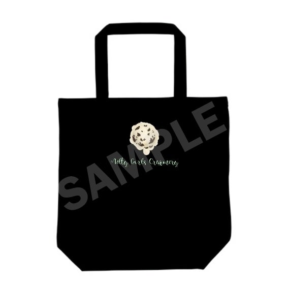 Tシャツとお揃いのデザインのトートバッグです。生地は厚手のキャンバス地で、色はブラックです。サイズは、本体/約W340×H260×D100mm 持ち手/約25×470mm 容量/約6Lです。B5の写真集も、A4サイズも入るとても便利なサイズです!たくさん荷物を入れて普段からどんどんお使いいただけるような、メンバー一押しのグッズです。そのままシンプルにもお使いいただけますし、アイスクリームモチーフのチャームをつけたり、持ち手にリボンを飾ったり、とことん可愛いアレンジもおすすめです!黒なので汚れが目立ちにくいのも嬉しいですね。