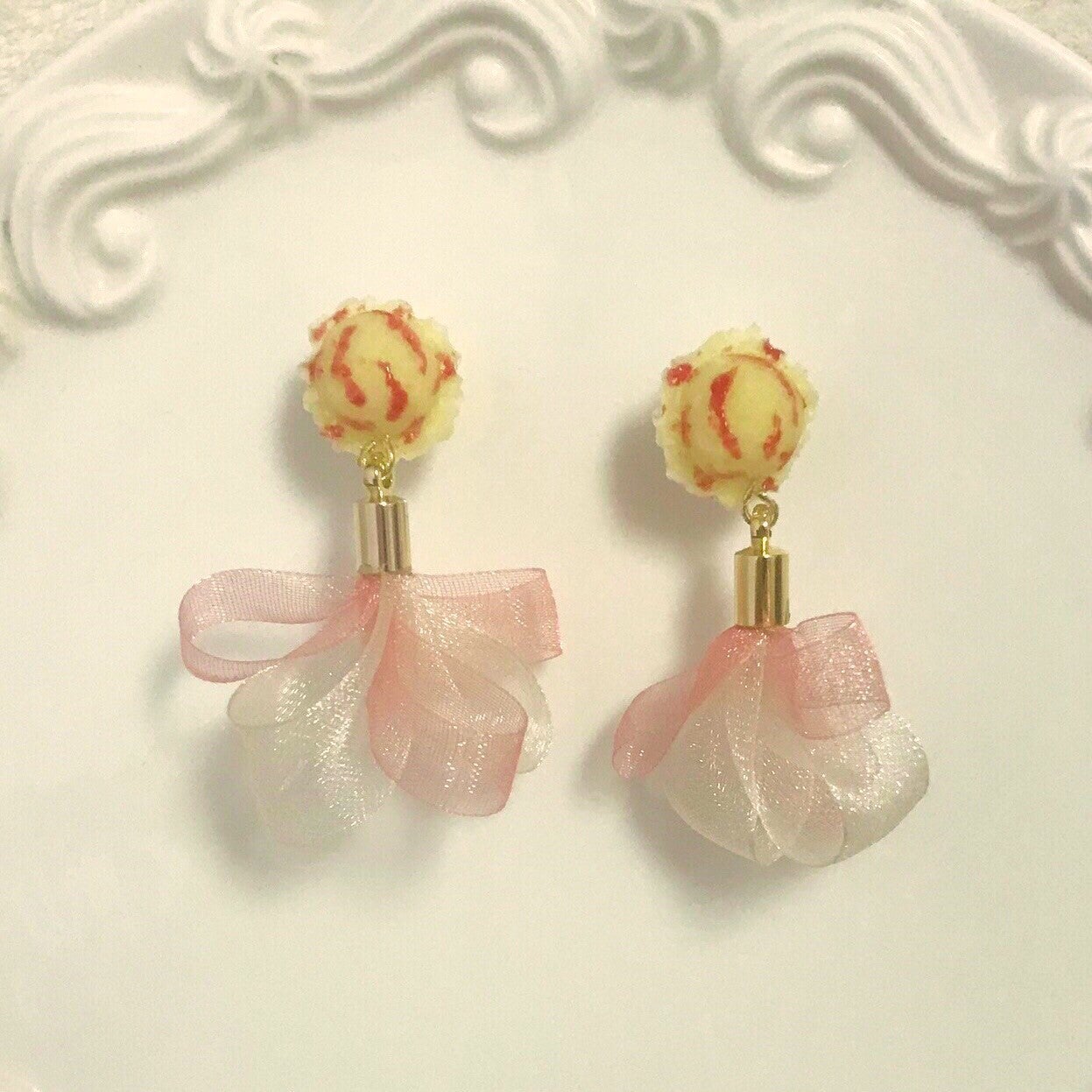 ストロベリーチーズケーキをイメージしたアイスクリームがモチーフの、ハンドメイドのピアスです。ピンクと白のオーガンジーリボンのタッセルをつけ、揺れ感がとても可愛い大ぶりなデザインに仕上げました。全身ガーリーなコーディネートにももちろんよく合いますし、ボーイッシュなコーディネートとアップヘアに合わせ、こちらのピアスをアクセントにするのもおすすめです!