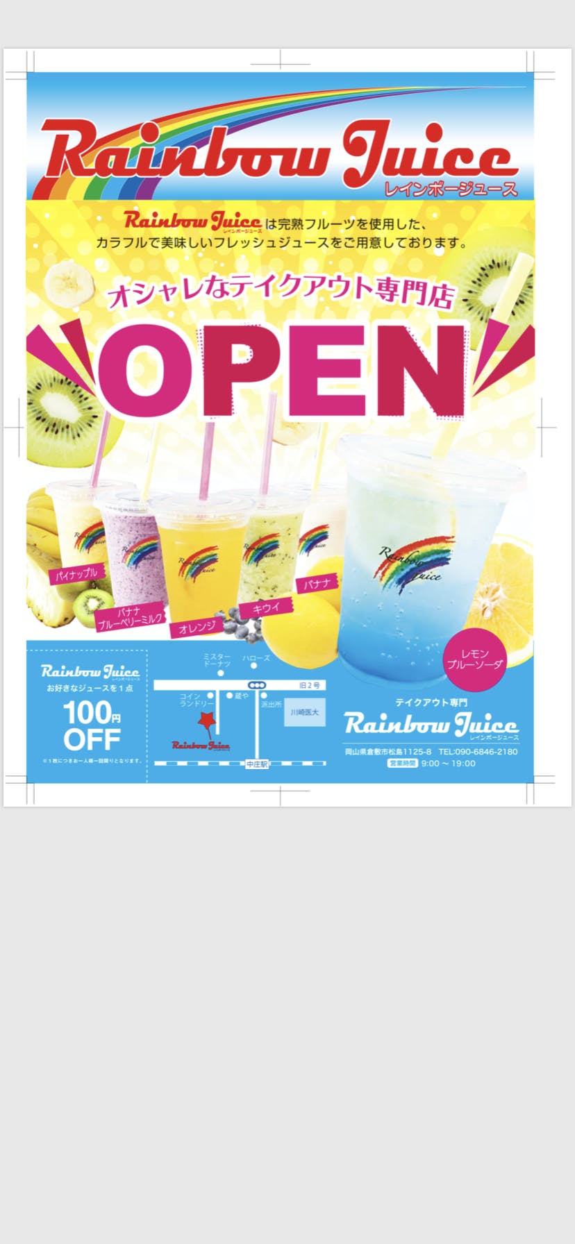 我がレインボージュースから、みなさんに元気と健康とおいしいを広めたいです!!田舎にはなかなかないフレッシュジュースやさんを駅近に作り、通勤や通学の途中にはもちろん、小さなお子さんや、お年寄りまで幅広い層に楽しんでもらえるお店作りに精進します!