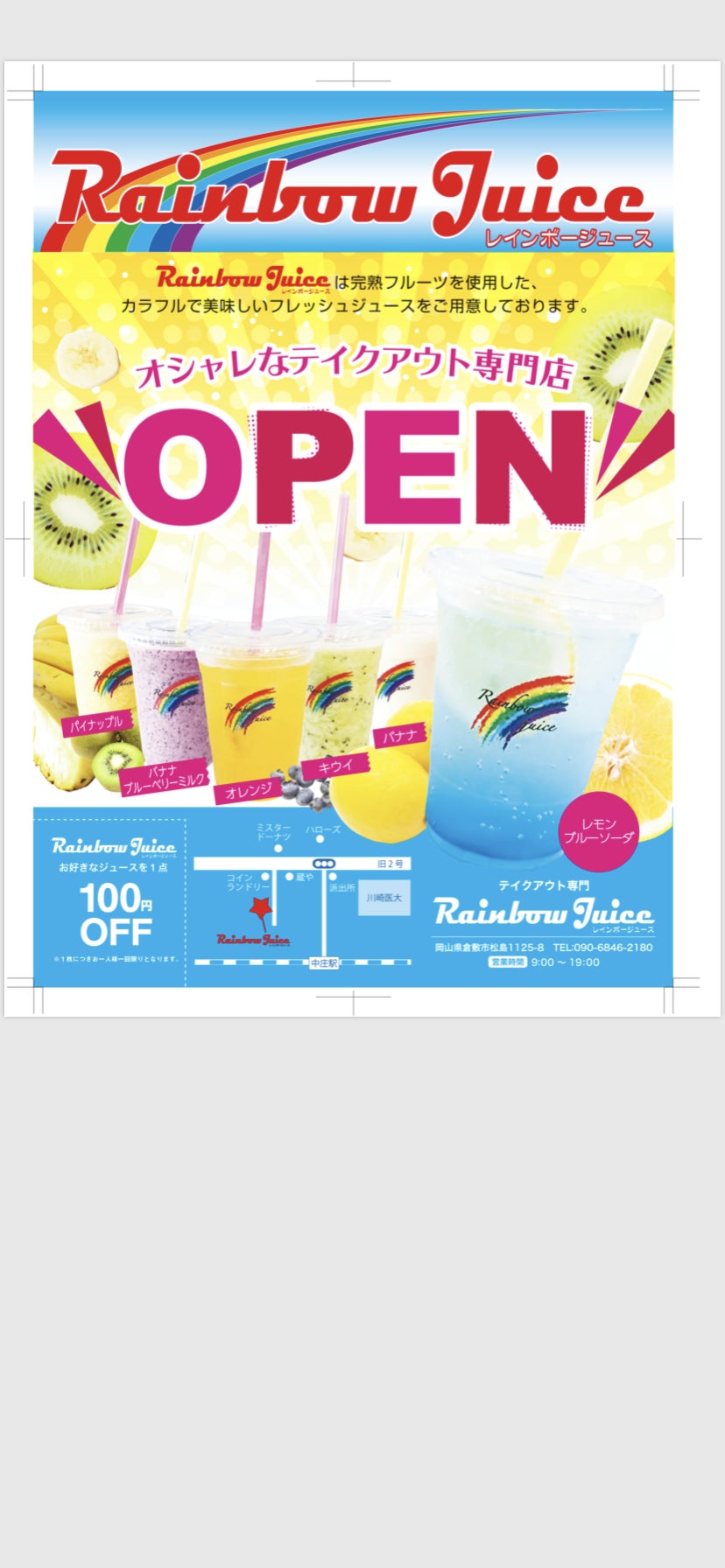我がレインボージュースから、みなさんに元気と健康とおいしいを広めたいです!!田舎にはなかなかないフレッシュジュースやさんを駅近に作り、通勤や通学の途中にはもちろん、小さなお子さんや、お年寄りまで幅広い層に楽しんでもらえるお店作りに精進します!