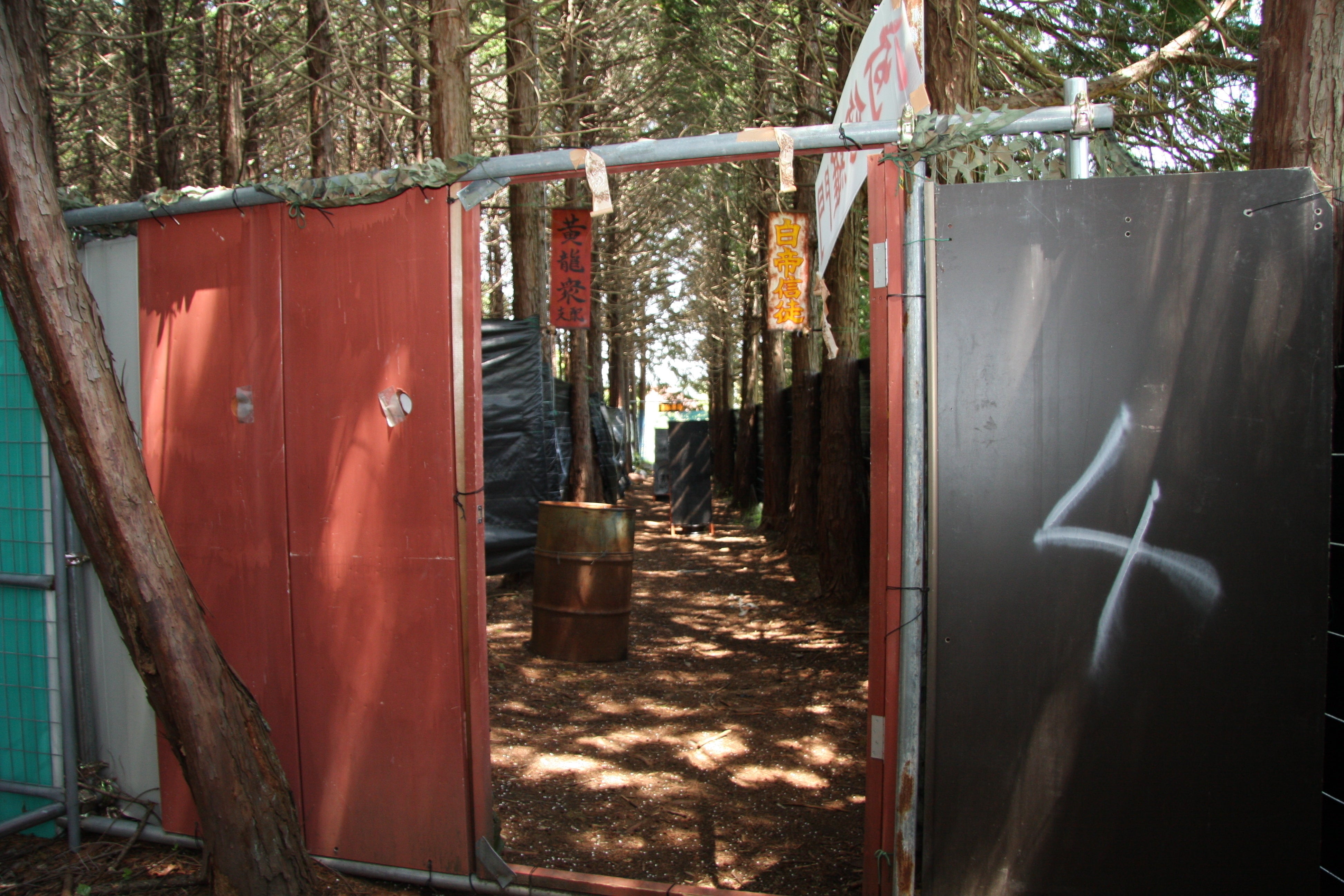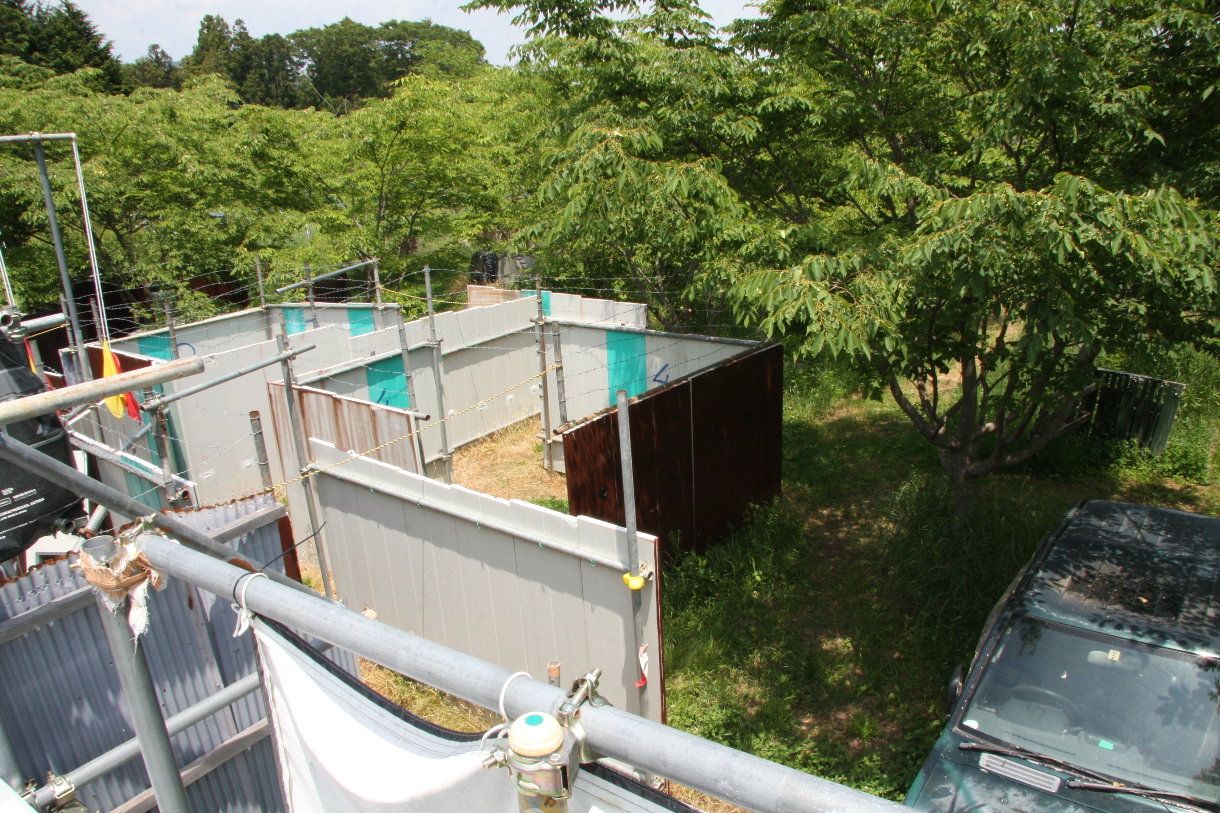 平地エリア入り口付近がブルーネットにて覆われてますが、強風や劣化により弾がぬけてくるので、建材にて100%BB弾が第二駐車場にこぼれないようにふさぐ。