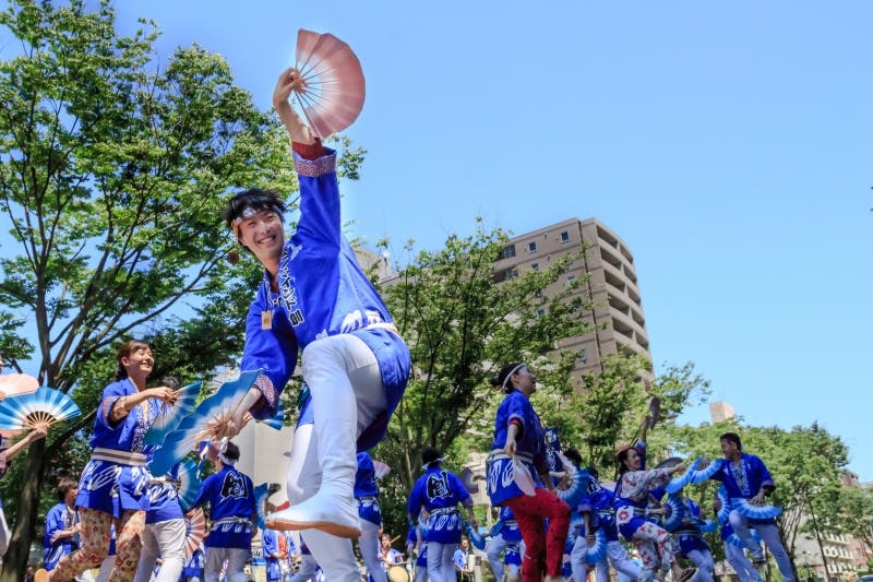 「はねっこ踊り」とも呼ばれるすずめ踊りはそもそも即興の踊りですが、伝承された踊りをベースに考えられた基本となる動きが存在します。中腰でやや前かがみの姿勢、手には扇子を持ち体の前で大きく開いたり閉じたり左右に振ったりします。足は左右に「ぴょんぴょん」跳ねながら体の前に蹴り出すような動きが基本のようです。あとはお囃子に合わせ思い思いに楽しく体を動かすのがすずめ踊りです。ちなみに伝承されている踊りは、片足で数歩飛びながら体の前で腕を回転させるような動きとなっています。 現在、各祭連ではそれぞれ振り付けを創作してその技や美を競い合っています。様々な祭りやイベントで披露されるすずめ踊りは各祭連が工夫を凝らした振り付けやお囃子を競い合い、年々その規模を拡大しています。