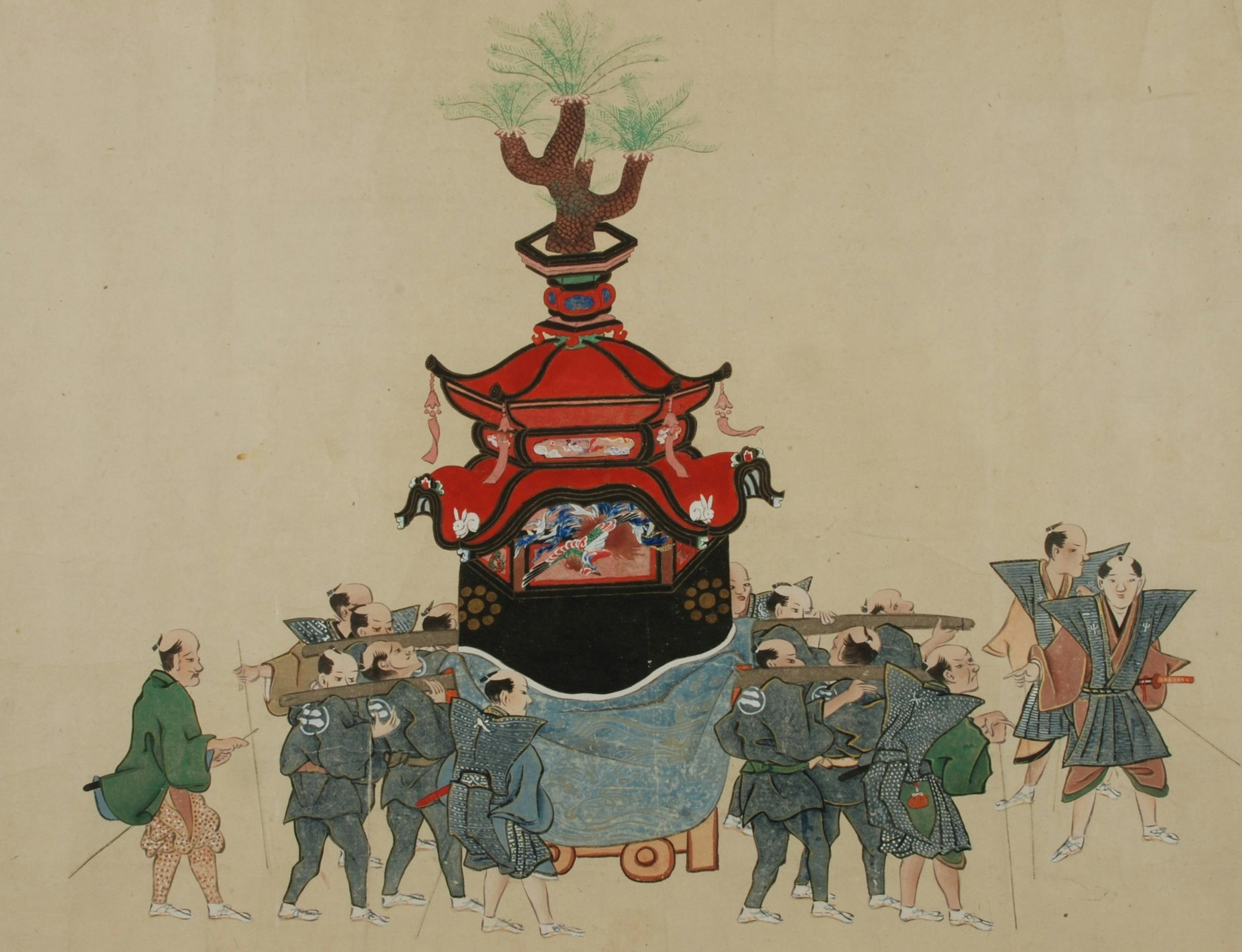 当時の祭りの様子は江戸時代(19世紀初頭)の絵巻物に描かれ、現在の神幸行列はそれを忠実に再現しています。行列には私達の笠鉾蘇鉄をはじめ、40もの出し物が参加し、約1,700人が6キロの道のりを練り歩きます。静々と荘厳な雰囲気の中進む行列とは対照的に獅子や亀蛇、飾馬など勇壮に披露される演舞、町人文化と武家文化が融合した絢爛豪華な神幸行列は現代に甦る時代絵巻で、およそ20万人の観光客が詰めかけるまでになりました。