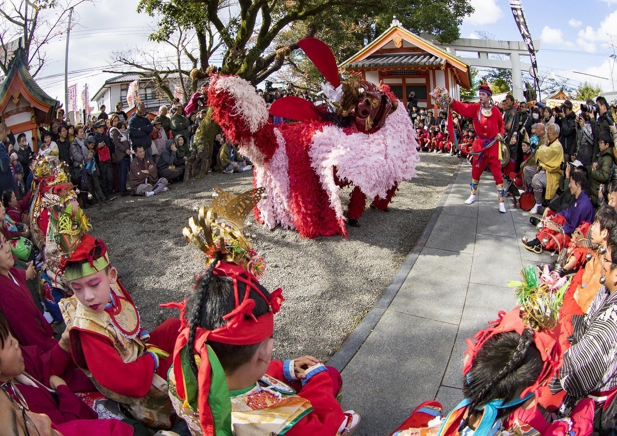 熊本県八代市で開催される八代妙見祭は、八代神社(妙見宮)の秋の大祭です。約380年の歴史があり町人文化が花開いた元禄の頃(17世紀終わり)には、八代城下の町々から笠鉾(かさぼこ)や獅子、亀蛇(きだ)など趣向を凝らし贅を尽くした出し物が奉納されるようになりました。