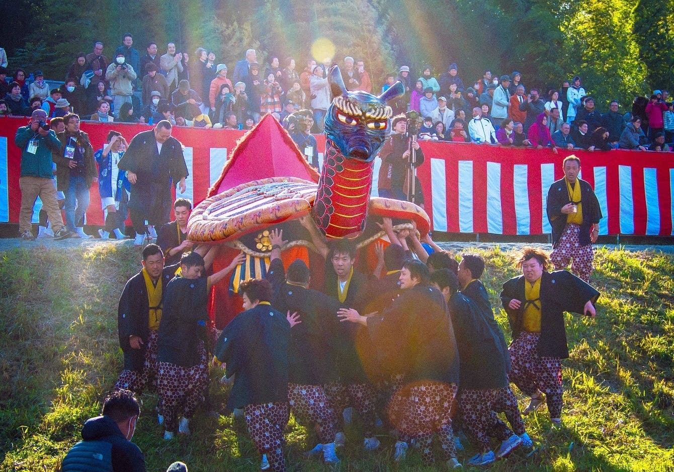 地元では「ガメ」お愛称で親しまれている亀蛇(きだ)は、文字通り亀と蛇が合わさった想像上の神獣で、その昔妙見神がその背に乗って来られたという伝承に由来する出し物です。