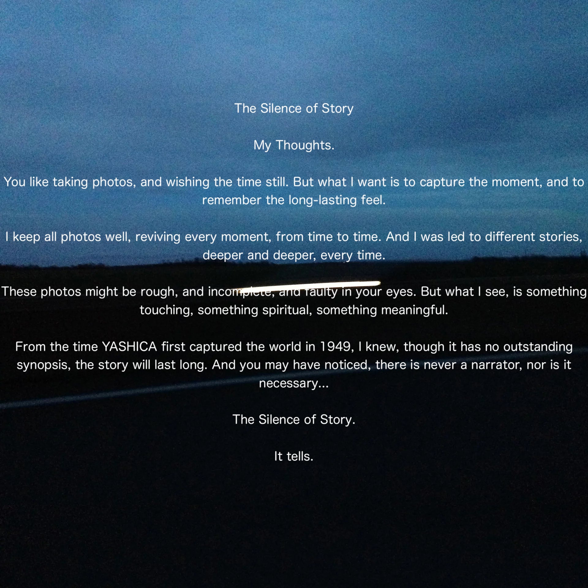 YASHICA Y35を使用すること、それは真実への旅です。YAHICA Y35にはモニターや削除ボタンが存在しません。全てのイメージが真実です。YASHICA Y35で捉えたその瞬間は全てがリアルで真実です。