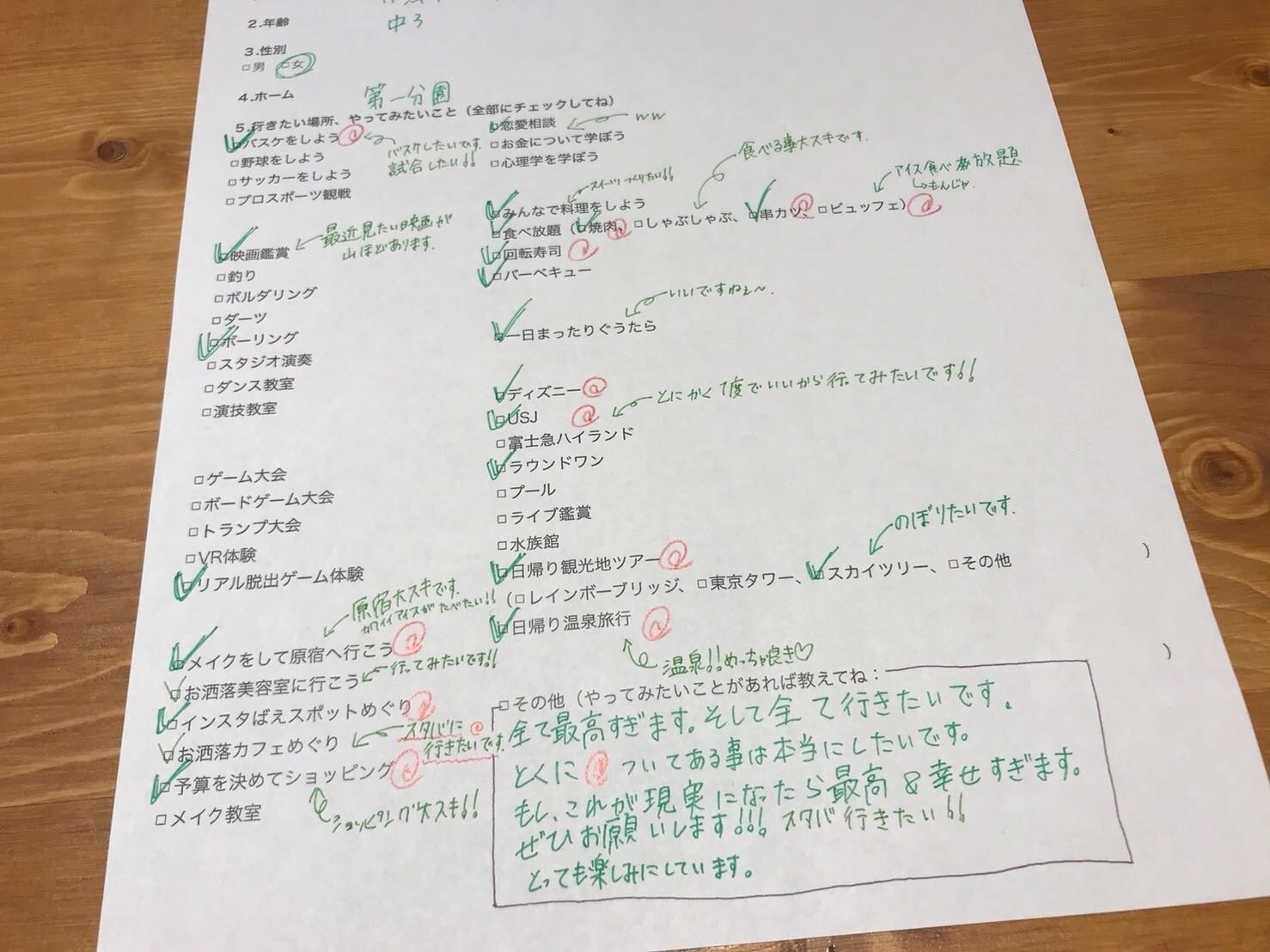 中高生の支援をはじめるにあたり、「子どもたちが本当にやりたいこと、行きたい場所」が知りたい!とアンケートをとったところ、予想以上の反応でした。