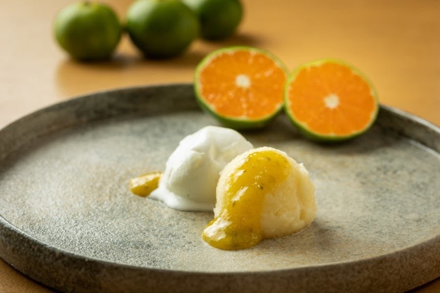 涼夏のソルベ:涼夏の果汁を贅沢に使用し、涼夏の特徴である酸味を活かしてさっぱりと仕上げました。