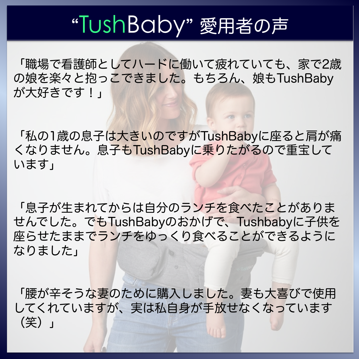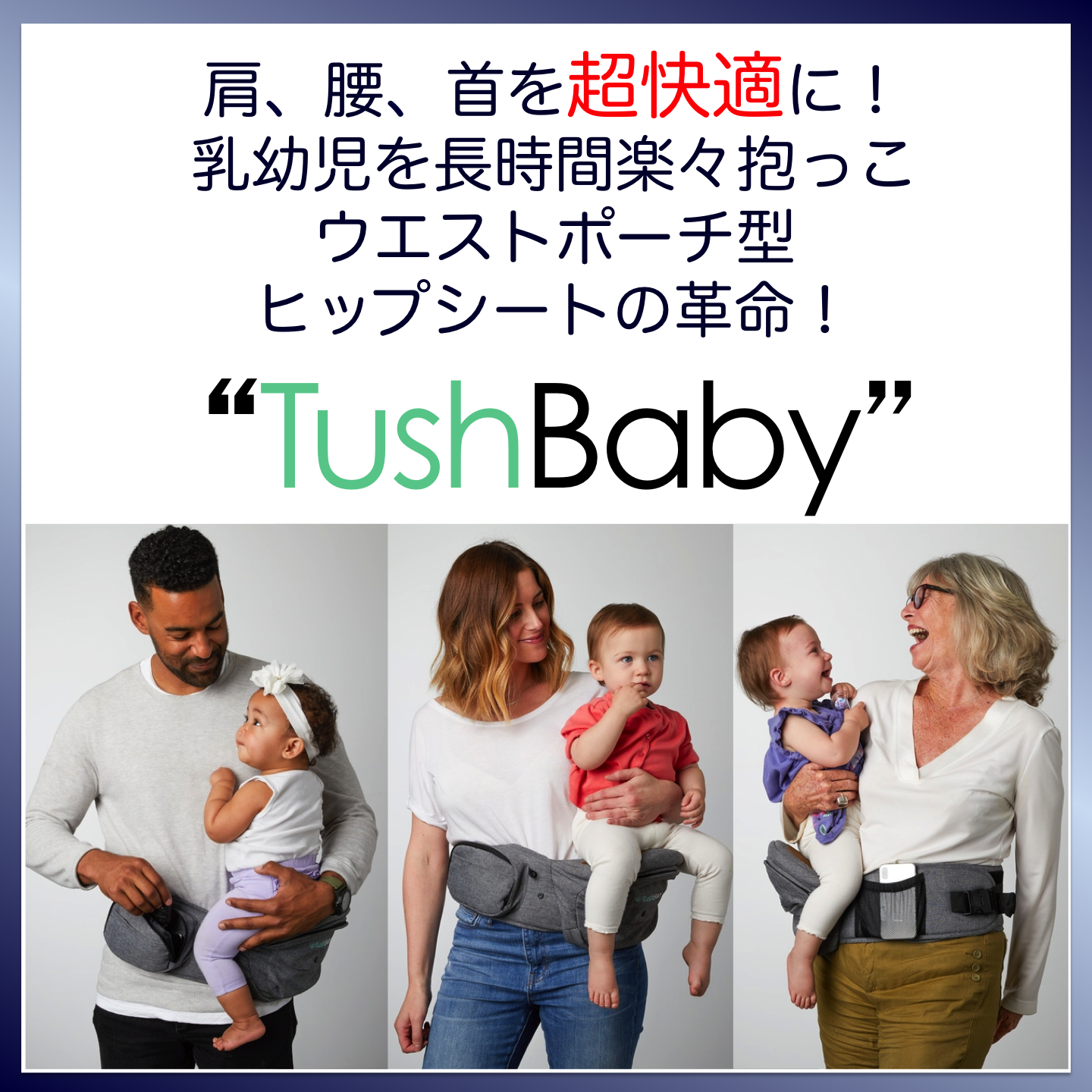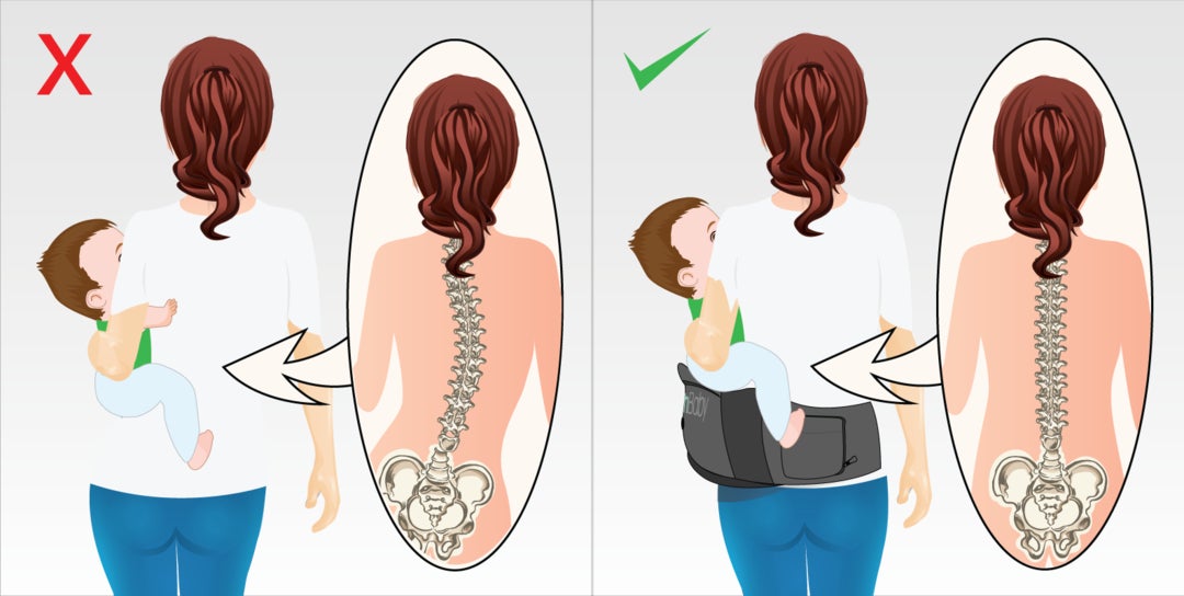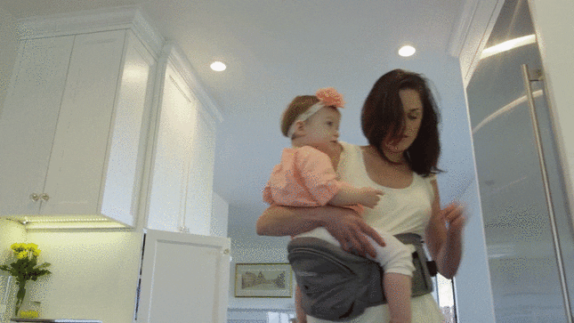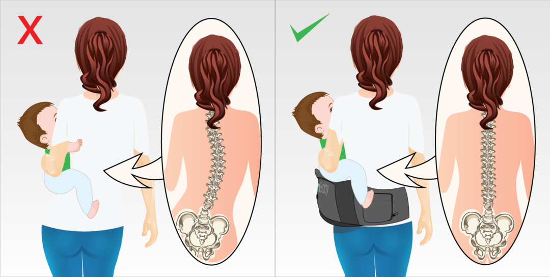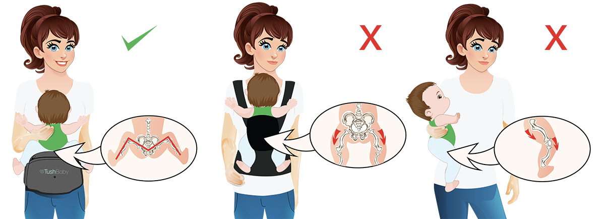 TushBabyは子供の体重を均等に分散する構造で、抱っこしても疲れにくく、頻回なポジション替えをする必要なし!