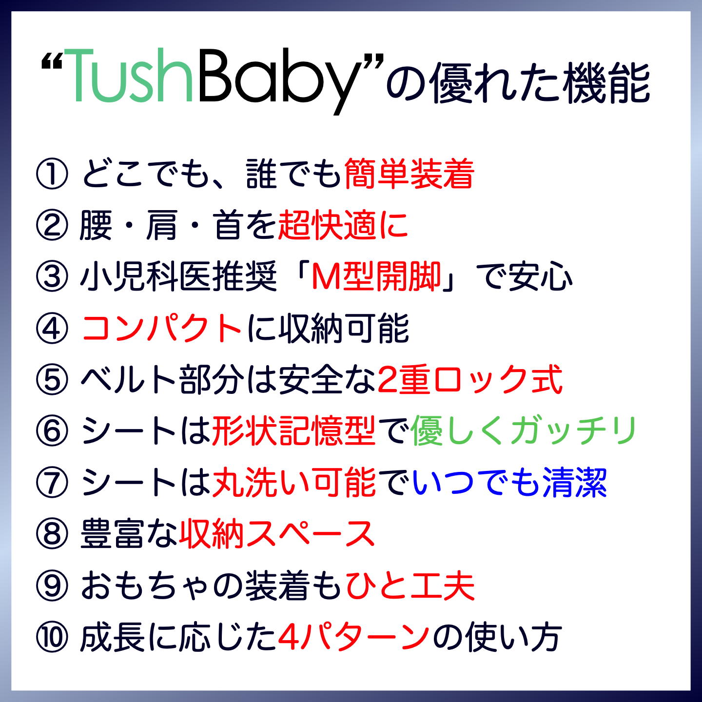 TushBabyは子供の安全性を考えて「形状記憶型シート」を採用しています。
