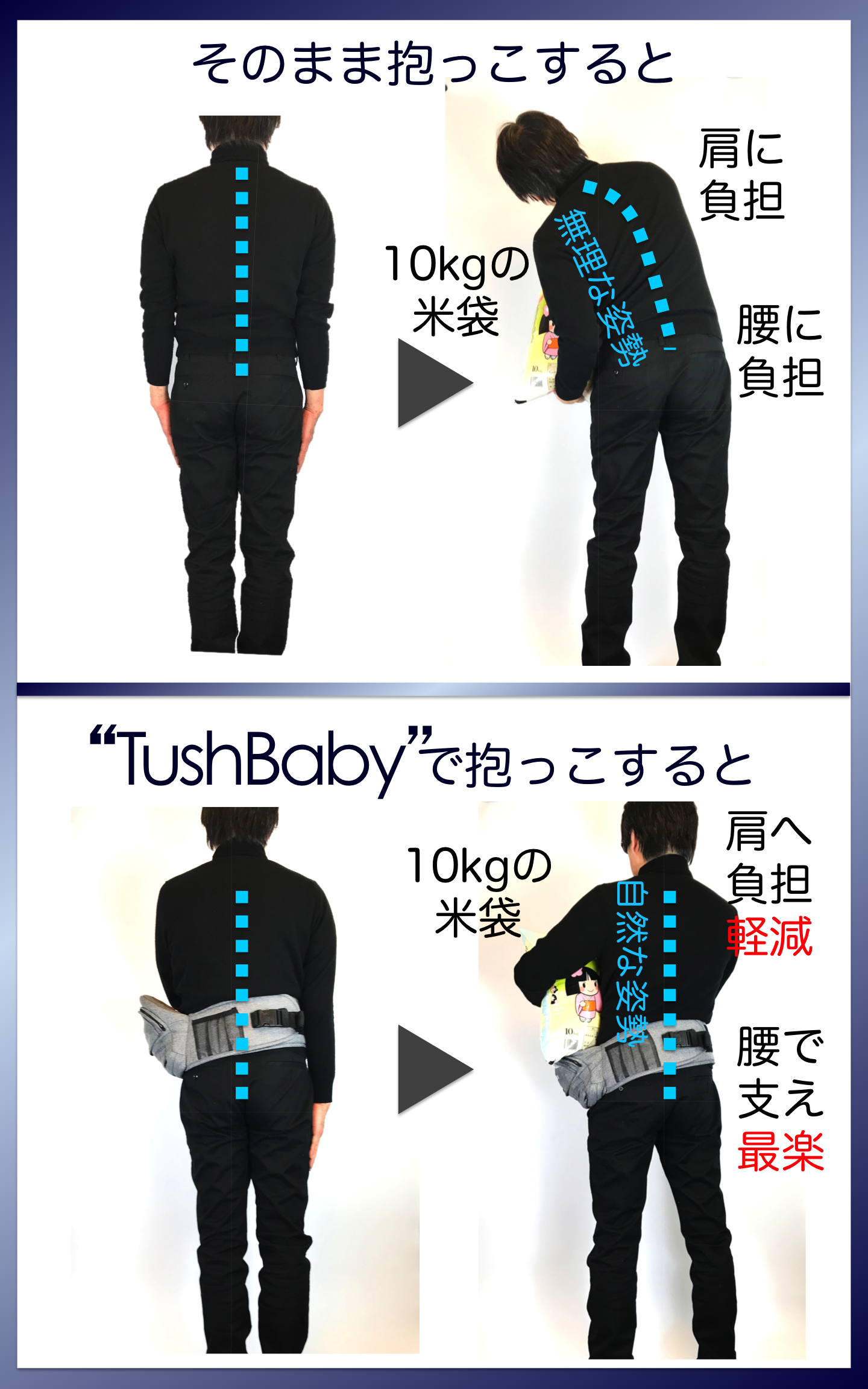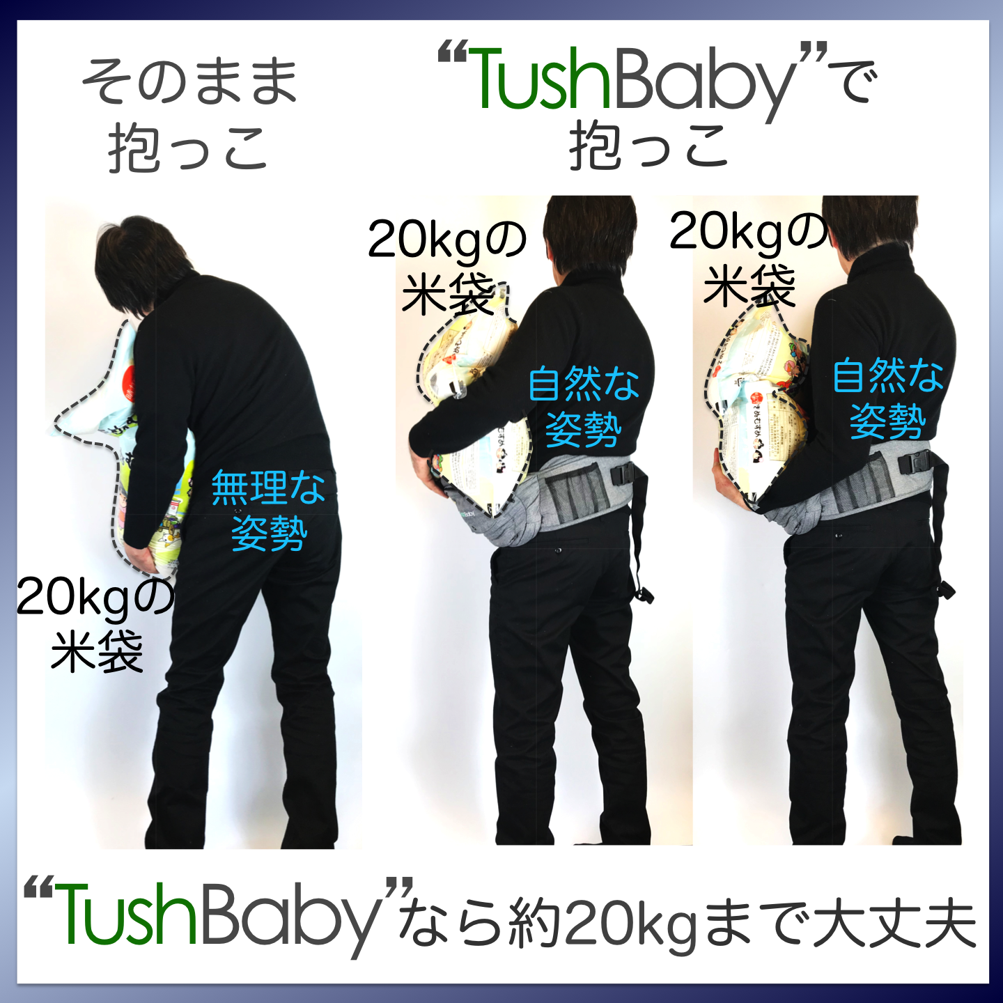 TushBabyを利用すると全身で20kgの米を抱っこしている感じでとても楽でした(笑顔)。