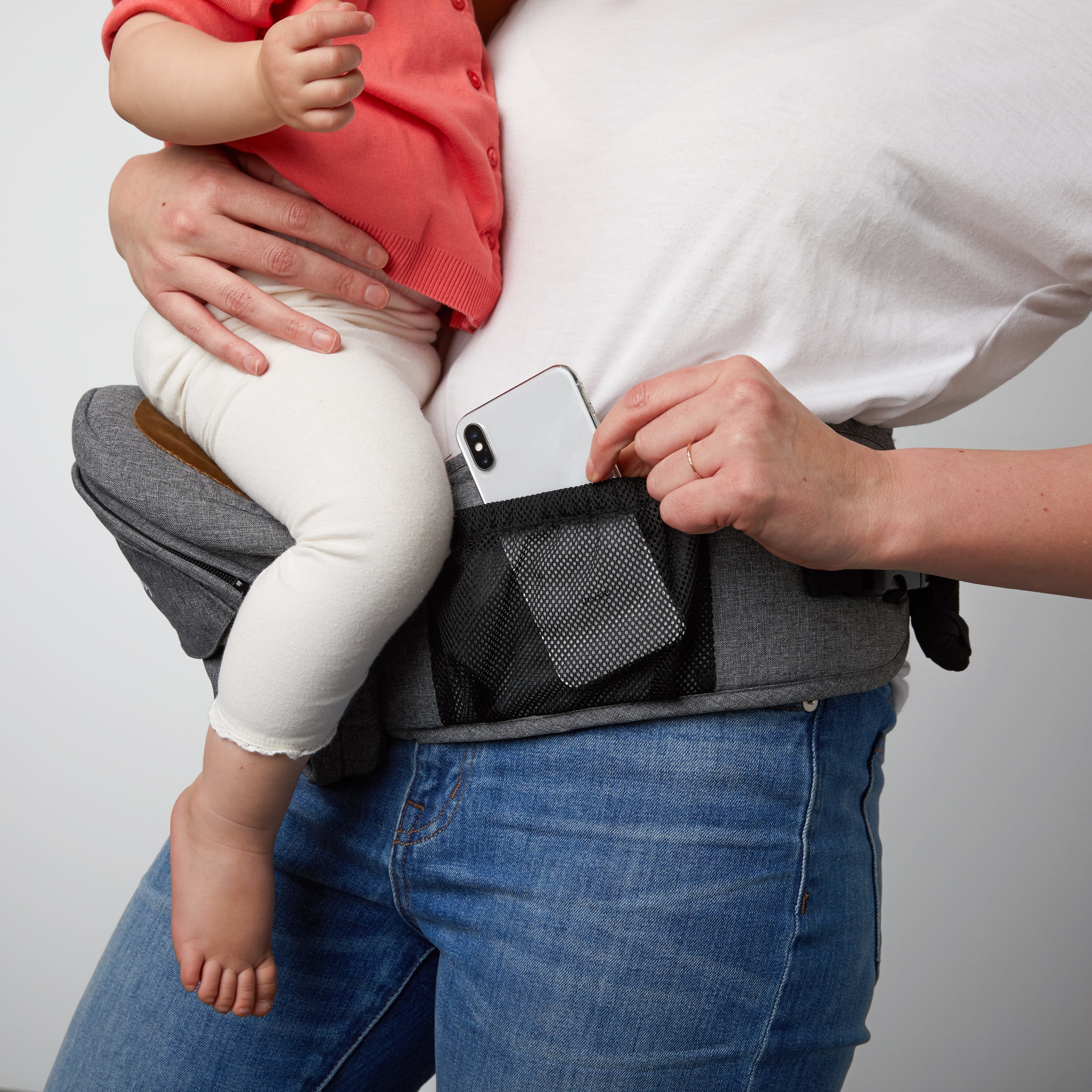 赤ちゃんを抱っこひもから出して、慌ててバッグをおろして、ファスナーを開けてスマホを取り出して.....、という面倒な動作もTushBabyにはありません!