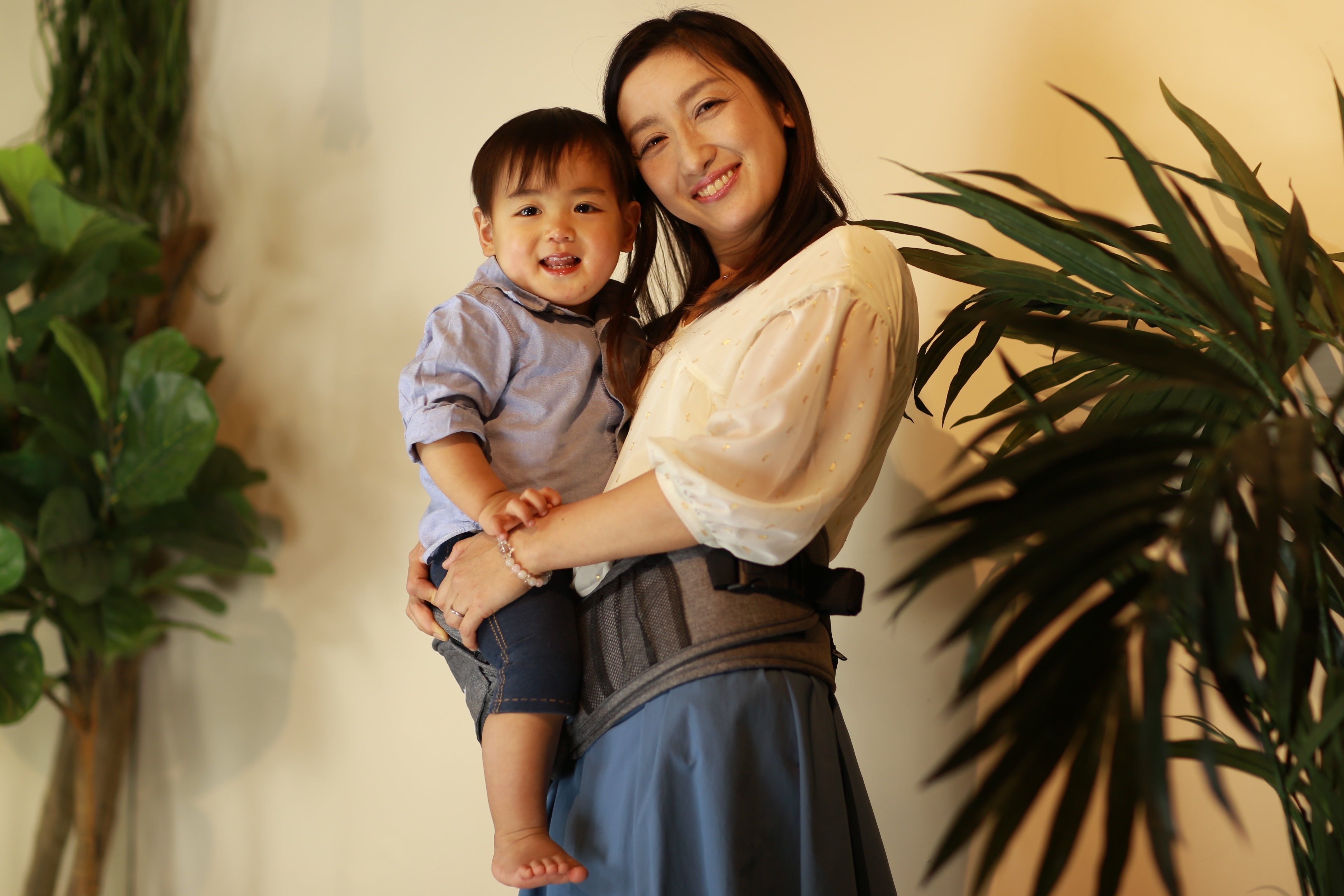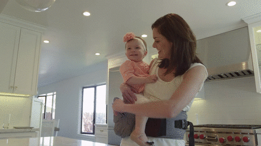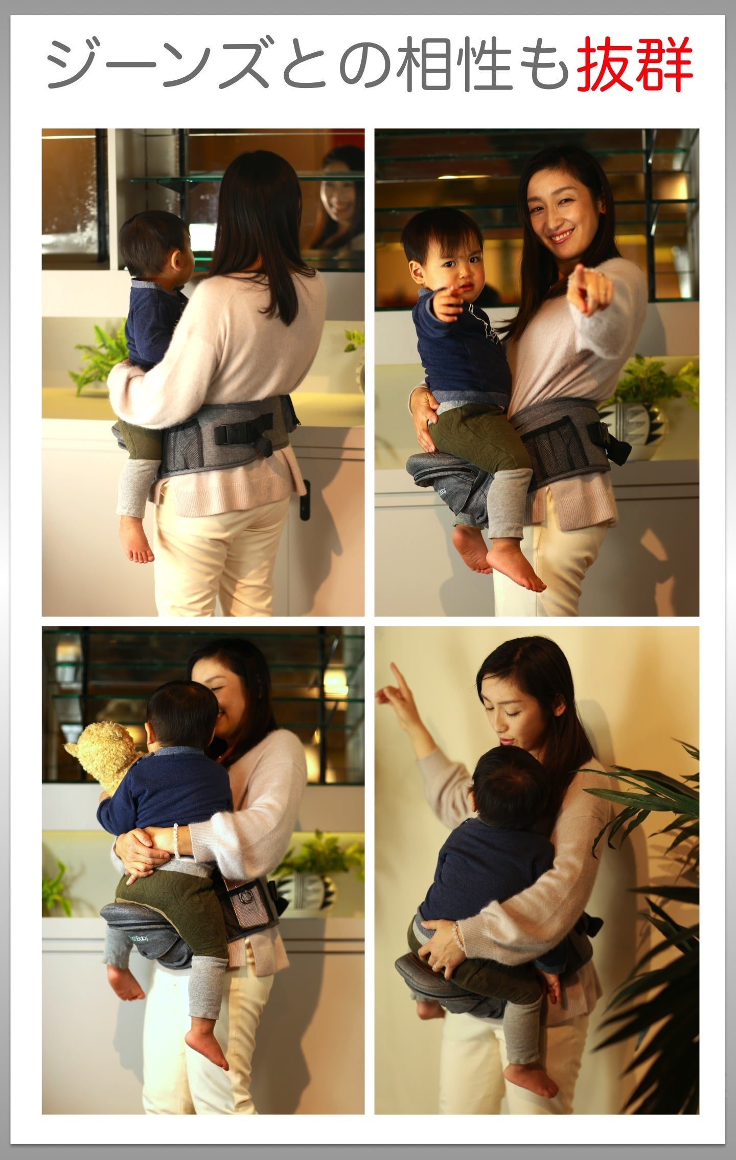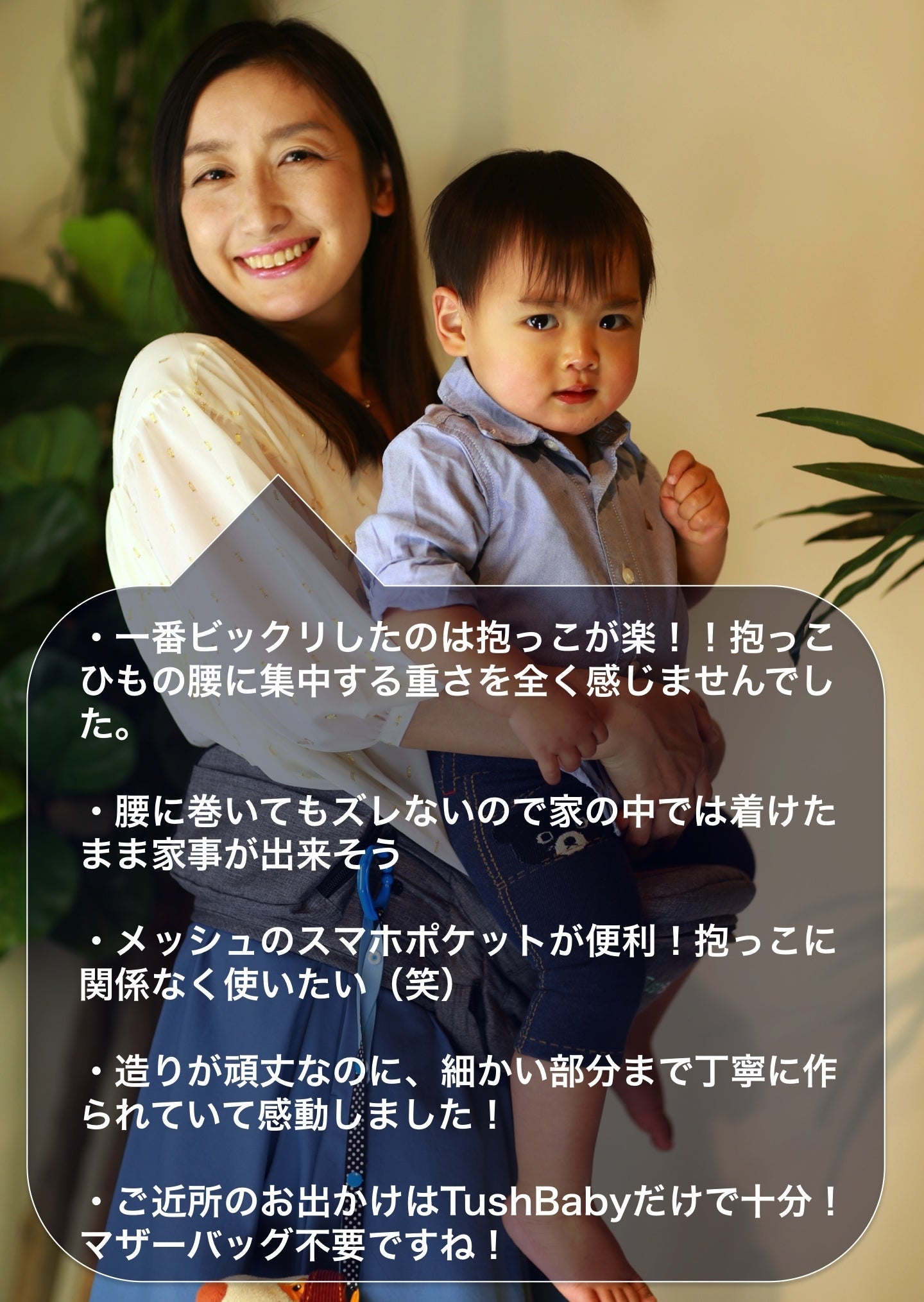 TushBabyに座ると子供はママの体温が感じられてハッピー、ママも子供の笑顔でハッピーになれます。