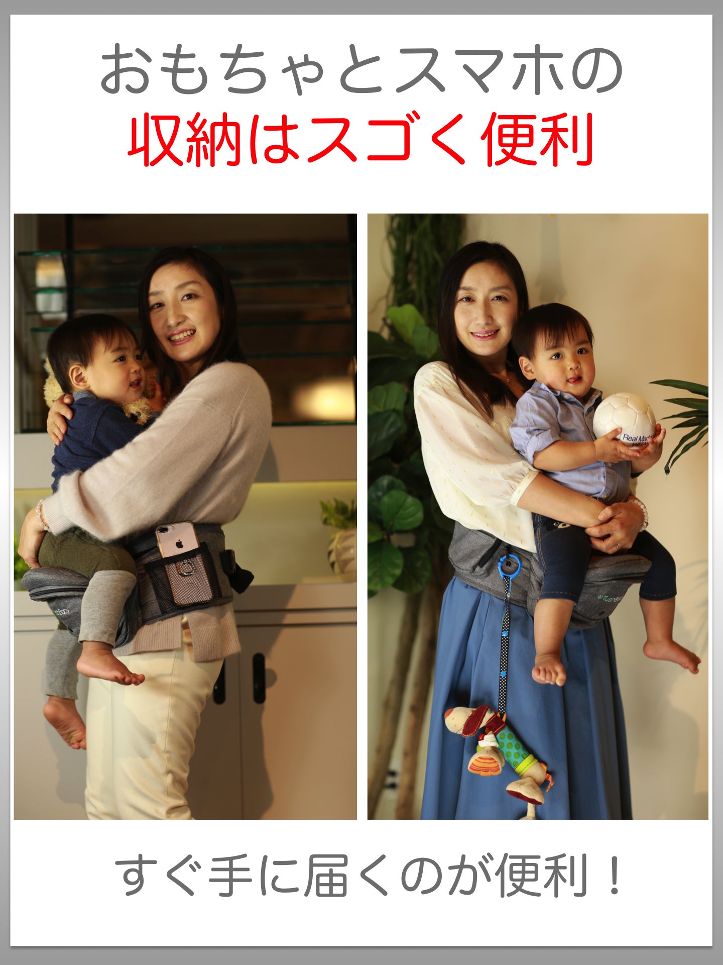 抱っこしたまま、片手でスマホを取り出し、簡単収納