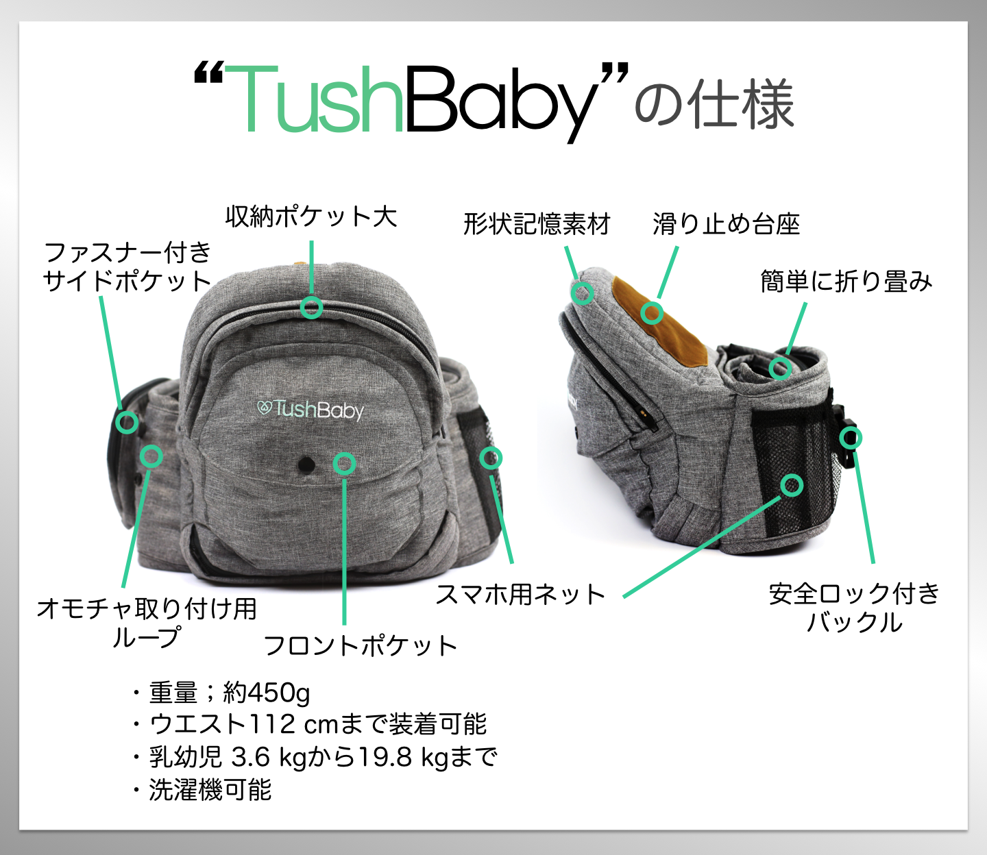 A:実際の”TushBaby”のバンドの長さは120㎝ですが、安全を考慮してウエスト112cmの方までのご使用をお願いしております。