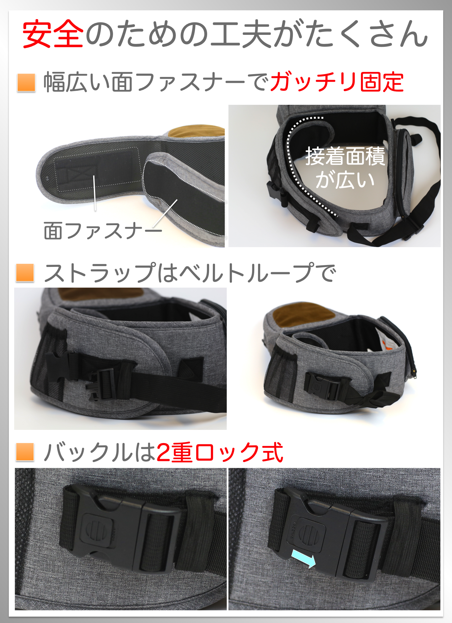 しっかりした面ファスナー固定とYKKバックル使用の二重ロック!!