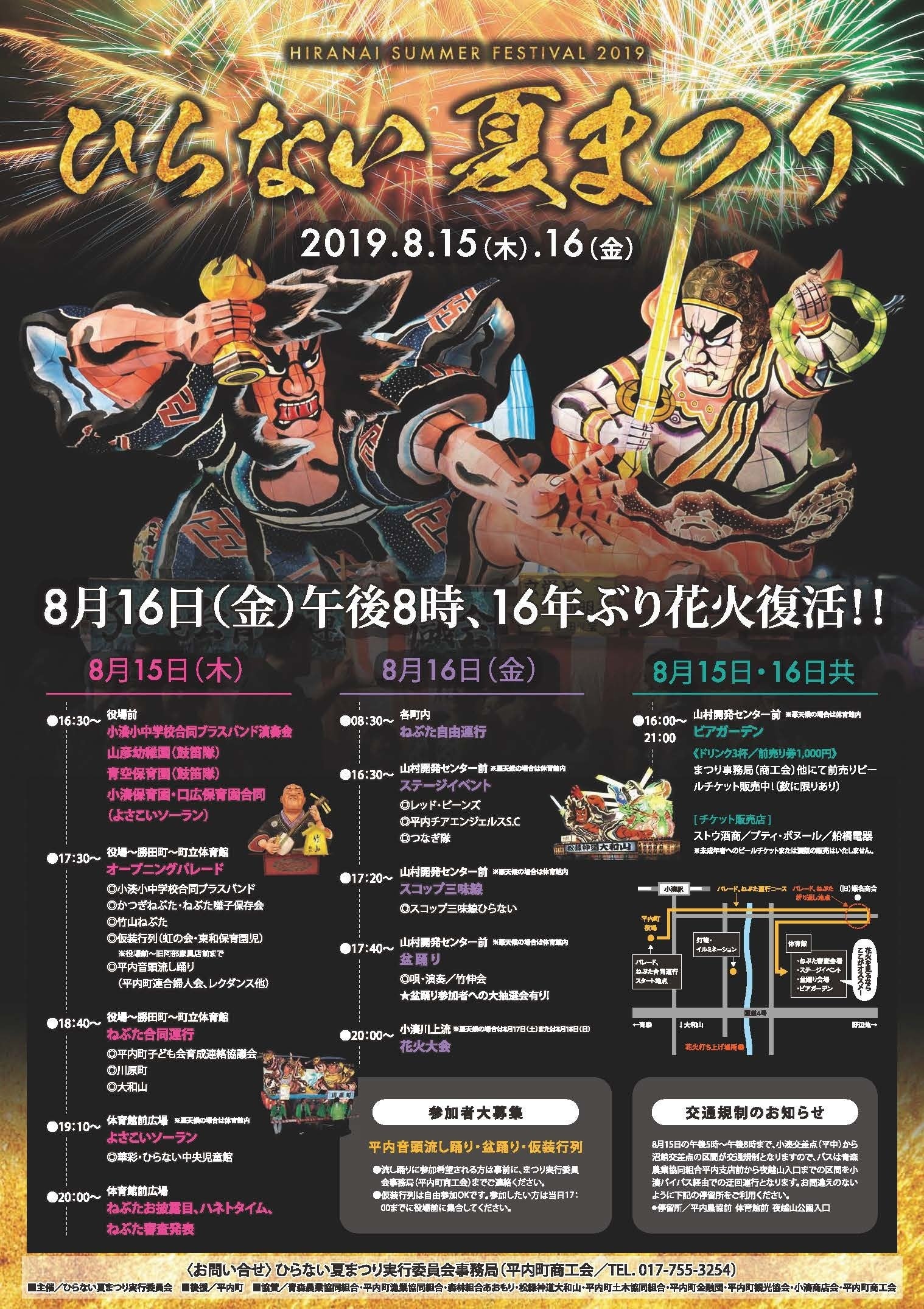 夏まつりのスケジュールや各会場のマップ、そして花火を見るオススメの会場も載っている!