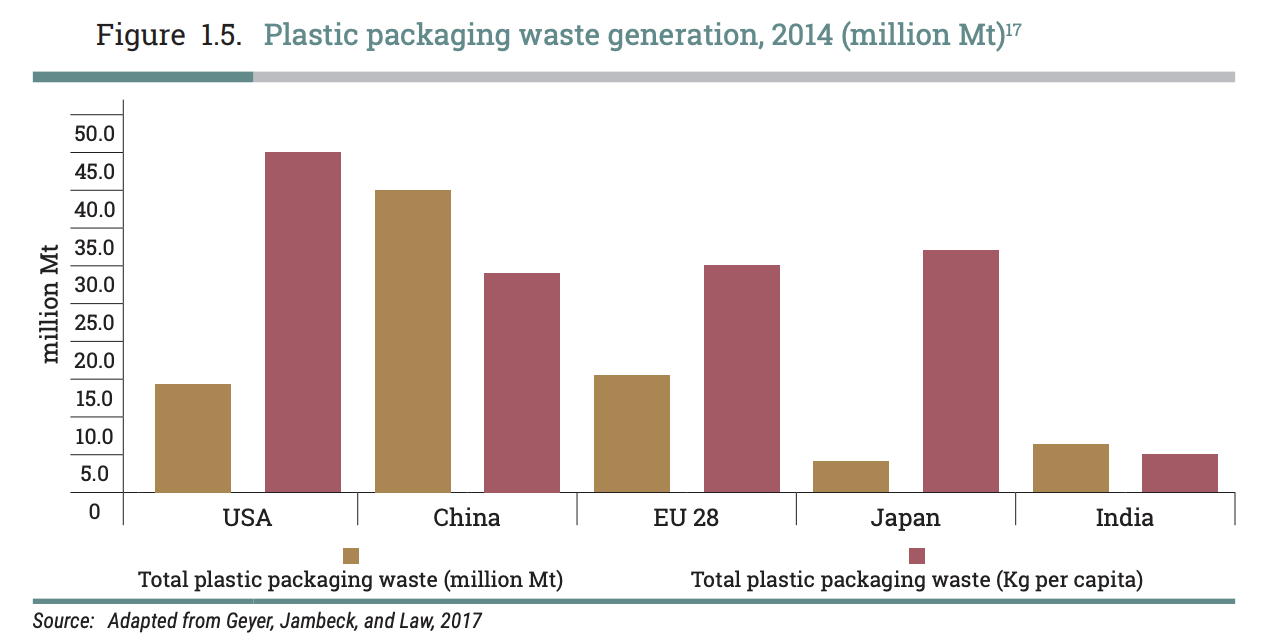 日本は昔からプラスチックの分別に力を入れたり、ポイ捨てをする人が少ないことで知られていますが、実際は、アメリカにつぎ2番目にパッケージ用のプラスチック使用量が多い国です(UNEP 2018)。また日本近海には、世界平均の27倍のマイクロプラスチックが漂っているとの報告もあります(Isobe et al. 2015)。