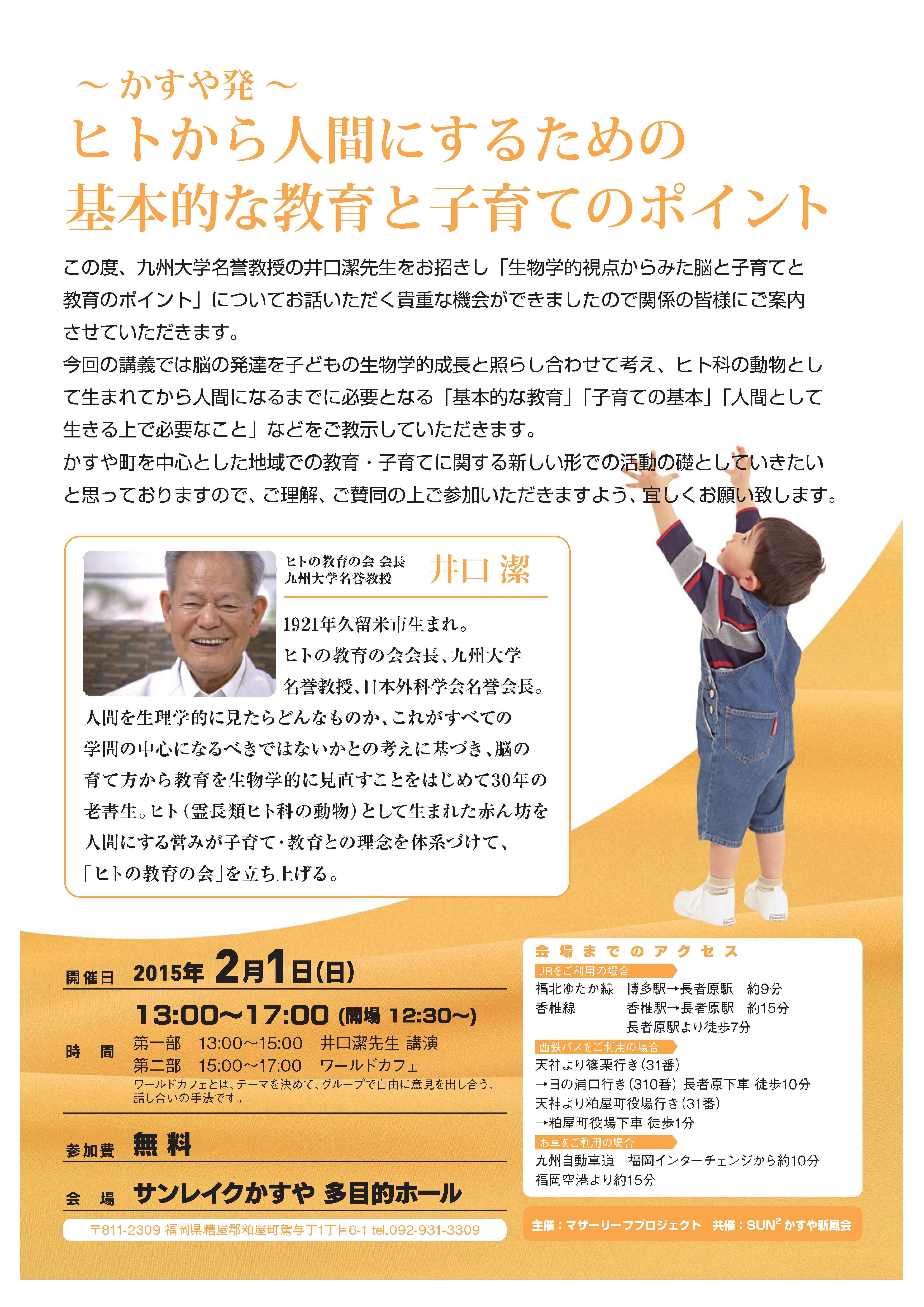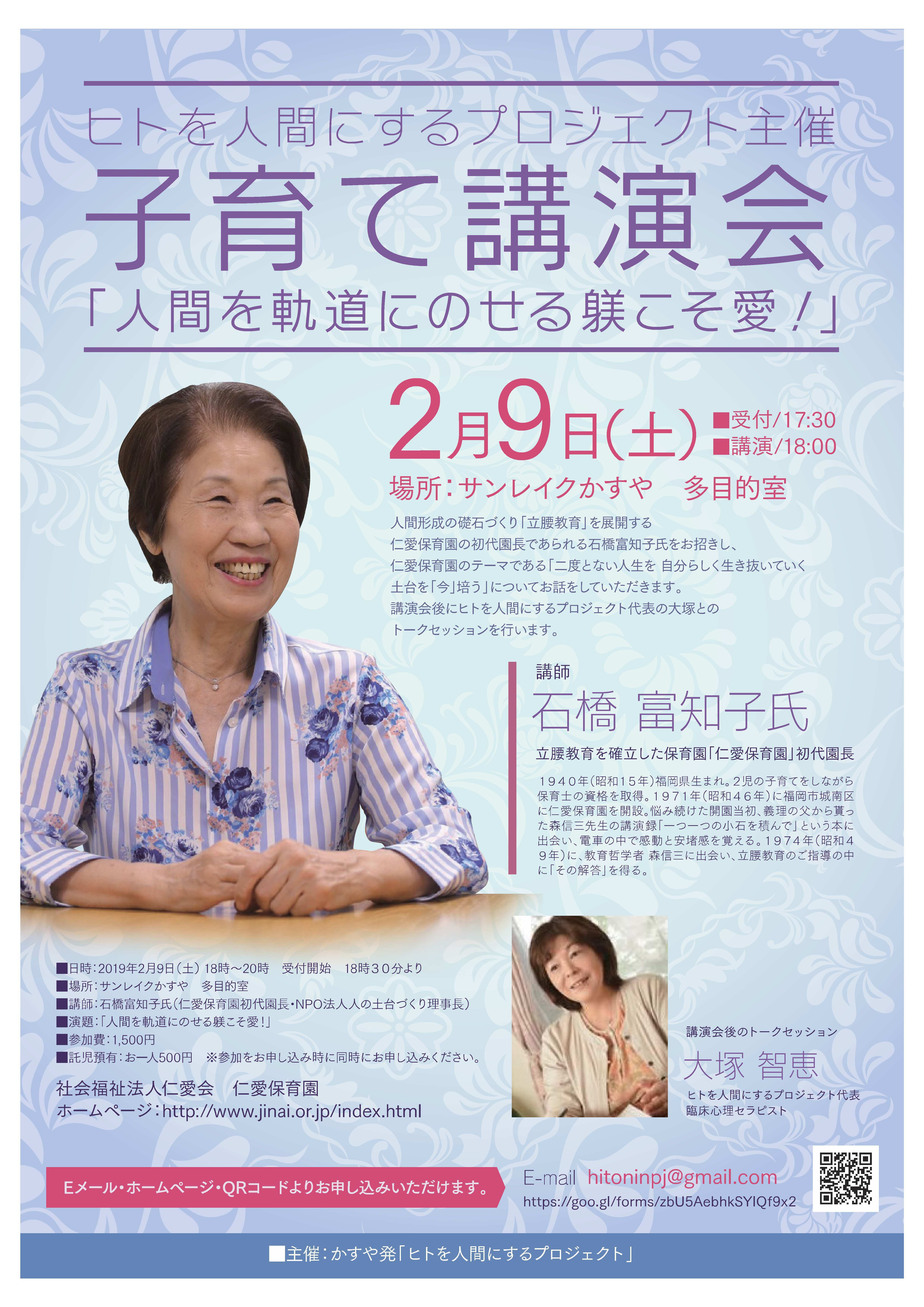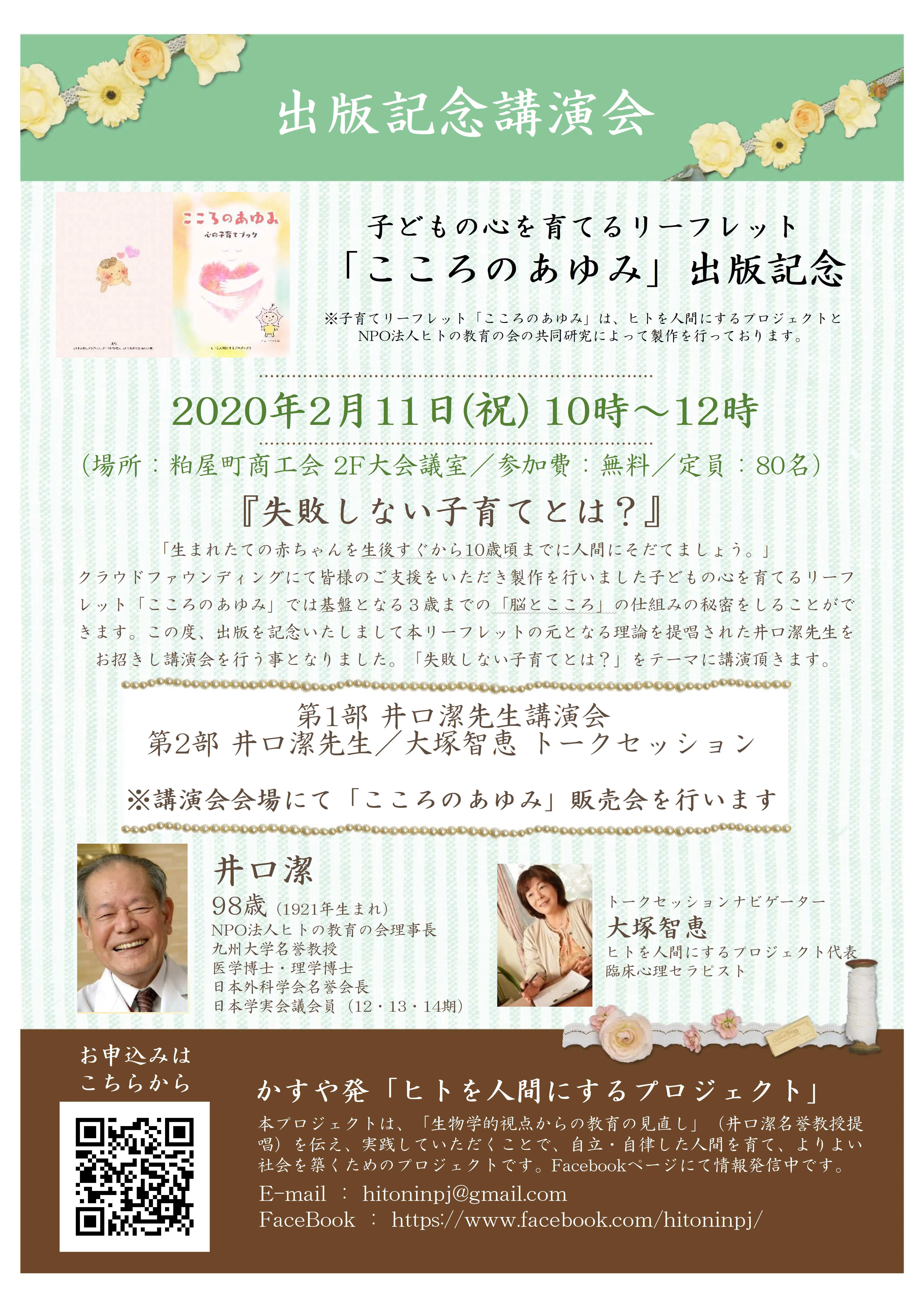 2020/01/27 18:40【出版記念講演会(2020/2/11)のご案内】「子どもの心を育む【こころのあゆみ 子育てブック】を出版し子育てを応援したい!」プロジェクト を応援いただいている皆様、こんばんは。ヒトを人間にするプロジェクト クラウドファウンディング担当の村井でございます。昨年末から年始にかけましてご支援いただきましたプロジェクトのリターンとして【こころのあゆみ 子育てブック】を送付させて頂きましたが、皆様のお手元に届きましたでしょうか?当初より発送予定が遅れてしまい大変申し訳ありませんでした。おかげさまでなんとか無事に総数を送付することができました。ご支援いただきました皆様には心より感謝いたします。もし手違いなどでお手元に届いていない方がおられましたら大変お手数をおかけいたしますが下記のメールまでご連絡いただけませんでしょうか?何卒よろしくお願い致します。◆連絡先ヒトを人間にするプロジェクトhitoninpj@gmail.comさて、今回は出版記念講演会の開催につきましてご案内いたします。皆様にご支援いただき無事に完成いたしました【こころのあゆみ 子育てブック】の出版を記念いたしまして、本リーフレットの元となる理論を提唱された井口潔先生をお招きし出版記念講演会を、2020年2月11日(祝)に行う事となりました。「失敗しない子育てとは?」をテーマに講演頂きます。本リーフレットに関します内容の解説や質疑応答を交えたトークセッションなども行いますのでぜひともご参加いただければ幸いでございます。なお、参加費が無料となっておりますのでお気軽にお申込みください。お申し込みは下記WEBフォームよりお願い致します。◆講演会お申込みお申し込みは下記よりお願いしますhttps://forms.gle/AenQYyquvAQGfG7Y8-----------------------------------------------------子どもの心を育む【こころのあゆみ 子育てブック】出版記念講演会(主催:ヒトを人間にするプロジェクト)-----------------------------------------------------『失敗しない子育てとは?』第1部 井口潔先生講演会第2部 井口潔先生/大塚智恵 トークセッション◆講演会内容○開催日: 2020 年2月11日 (祝日)10:00~12:00○開催地: 粕屋町商工会 2階大会議室/定員:80名(〒811-2314 福岡県糟屋郡粕屋町若宮2丁目3−1)○参加費:無料○お問い合わせ: hitoninpj@gmail.com◆講師プロフィール井口潔 98歳(1921年生まれ)NPO法人ヒトの教育の会理事長九州大学名誉教授医学博士・理学博士日本外科学会名誉会長日本学実会議会員(12・13・14期)◆トークセッションナビゲータープロフィール大塚智恵ヒトを人間にするプロジェクト代表臨床心理セラピスト もっと見る