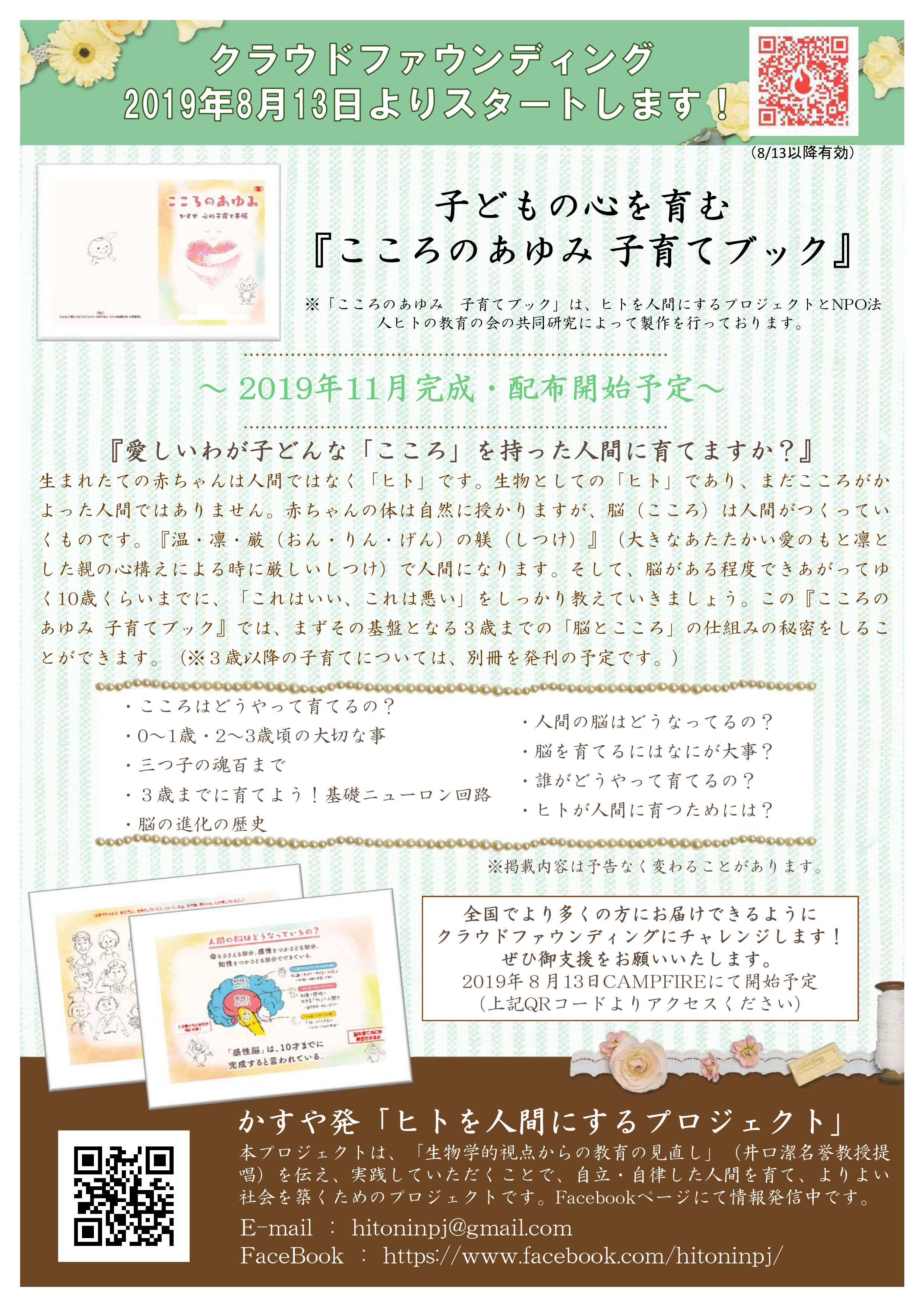 2020/07/14 17:35皆様、こんにちは「ヒトを人間にするプロジェクト」でございます。大変ご無沙汰しております。昨年、「子どもの心を育む【こころのあゆみ 子育てブック】を出版し子育てを応援したい!」ということでクラウドファウンディングに挑戦させていただき、皆様の大変多くのご支援の中、目標金額を達成し出版に至ることができました。その後、2月11日に出版記念イベントを行い井口潔先生よりお話いただき、より多くの皆様に知って頂く活動をおこなう予定になっておりました。しかし、皆様もご存知のように新型コロナウイルス感染症拡大の影響にともない活動ができない状態となっておりました。私たち「ヒトを人間にするプロジェクト」も6月の中旬からようやくではありますが活動を再開しております。クラウドファウンディングにより出版いたしました。時間がかかり誠に申し訳ございませんが【こころのあゆみ 子育てブック】 もインターネットによりお申込みいただける状態になりましたのでご連絡いたします。購入ご希望の方は、下記のアドレスよりアクセスいただき申込フォームにてお申込み宜しくお願い致します。今後とも何卒よろしくお願い致します。---------------------------------こころのあゆみ 心の子育てブック』ご注文はこちらhttps://peraichi.com/landing_pages/view/hitoninpj☆ お子様も手に取りやすい絵本仕様☆ 心の育て方が科学的にわかる☆ 医学博士・理学博士のお墨付き1冊1500円(税込)10冊以上は送料無料20冊以上10%off30冊以上20%off大量注文は別途お見積り致します。 もっと見る