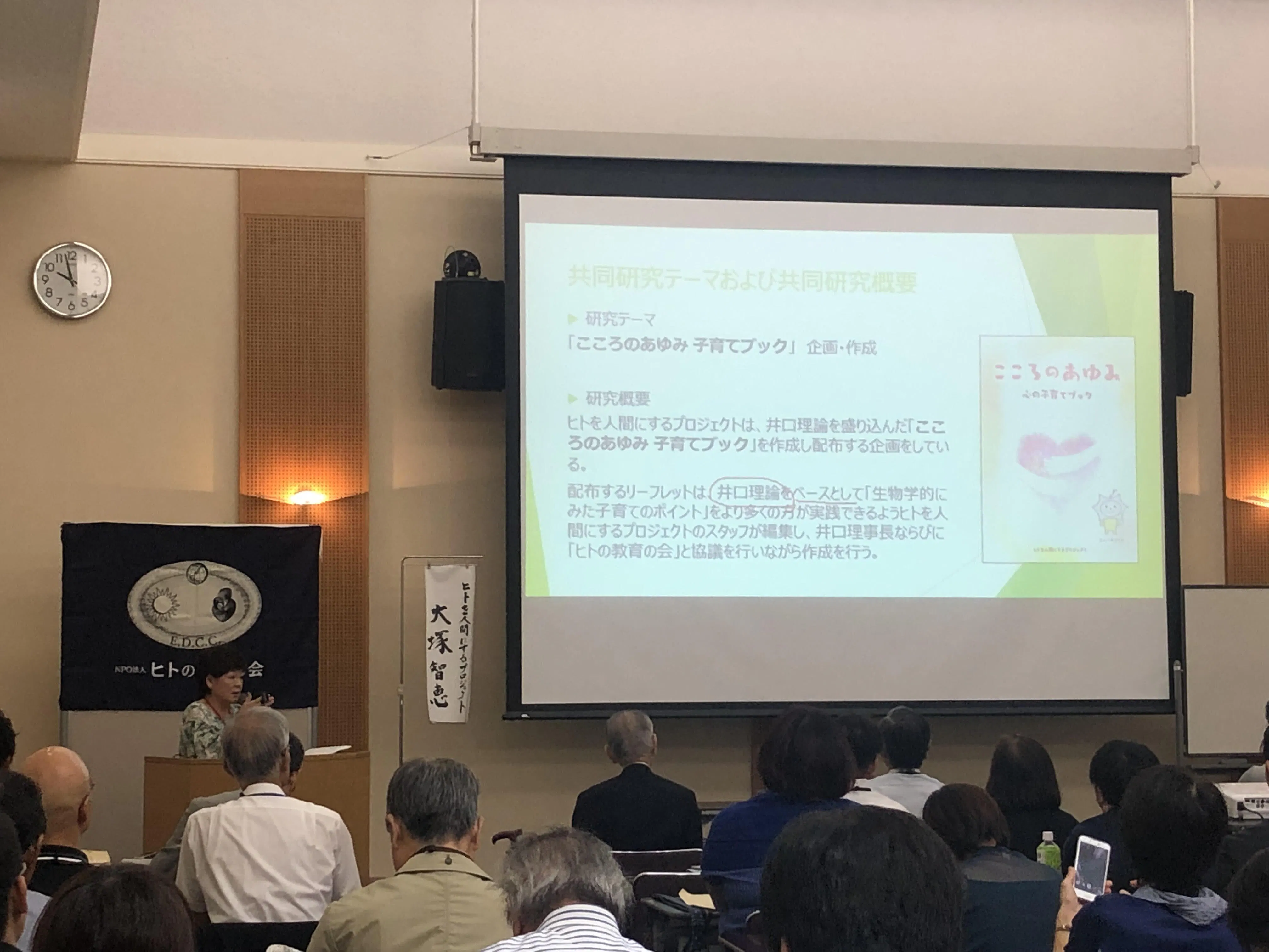 冒頭の掲載しました写真は、9月15・16日に九州大学医学部百年講堂大ホールにて開催されました「NPO法人ヒトの教育の会夏季合宿2019」にて井口生物学的人間教育実践発表のひとつの取組みとして今回の「こころのあゆみ 子育てブック」企画・制作について発表したときの様子です。会場におきまして多くの方に共感いただくことができました。今の時代に「こころの子育て」が必要だということをスタッフ一同実感した次第です。