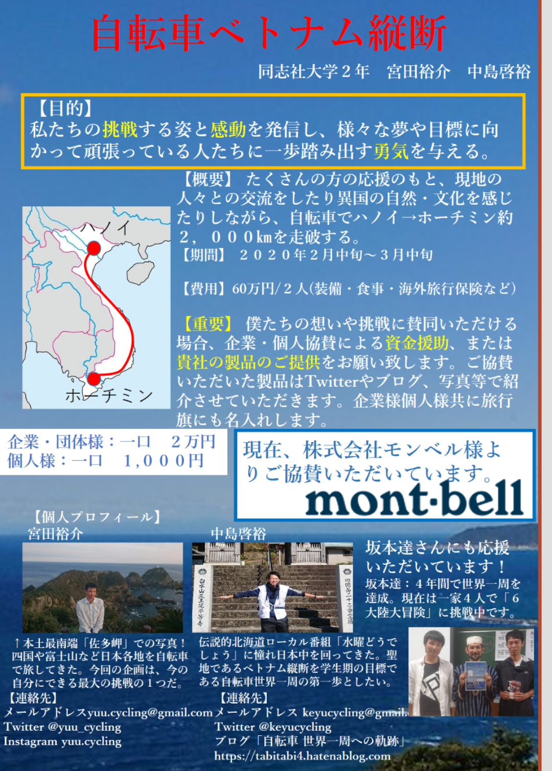 僕は高校3年生のころ大学受験に向けて、夢に英単語が出てくるほど必死で勉強していました。なぜそこまで頑張れたかというと、一輪車で世界一周している方をTwitterで見つけたからです。「自分も大学生になったら大好きな自転車で世界を走ってみたい!」と思い、親や友人など様々な方のサポートがあり大学受験を乗り越えられました。一輪車で世界一周していた方のように、自分も誰かを勇気づけ、目標に向けて進むモチベーションの1つになれればと思いました。ベトナム縦断を通して多くの方々の挑戦を応援したいと思っています。