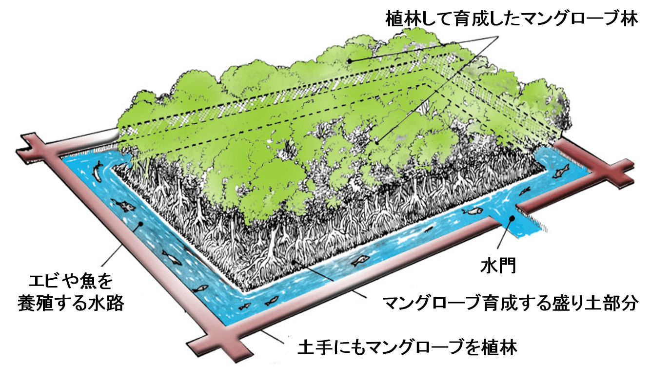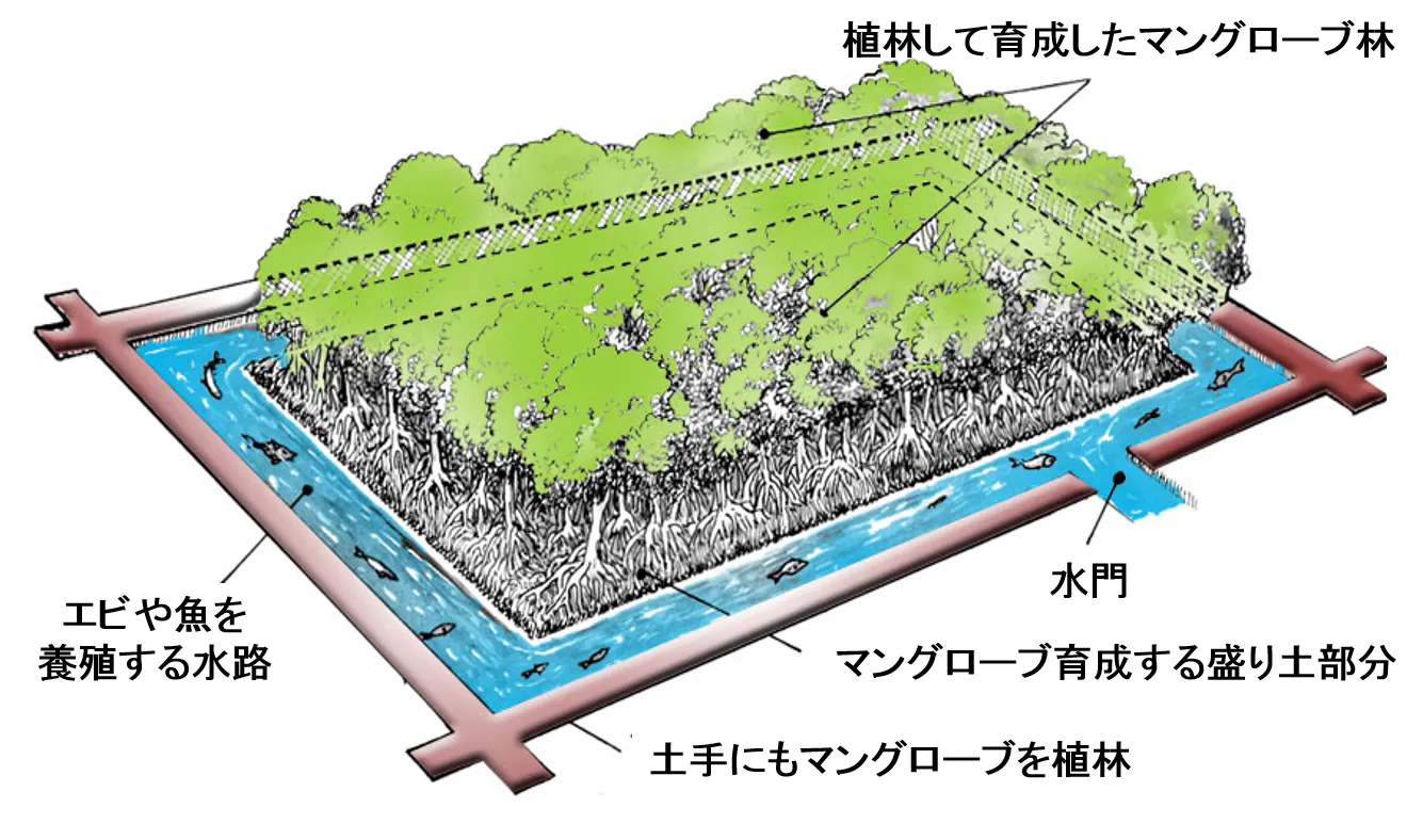 マングローブの周りに養殖池を設けることで、エビや魚の養殖が行えます。実際に池の管理をしてくれる地域の住民の生活の糧にもなることから「持続可能」な森林育成が実現するのです。