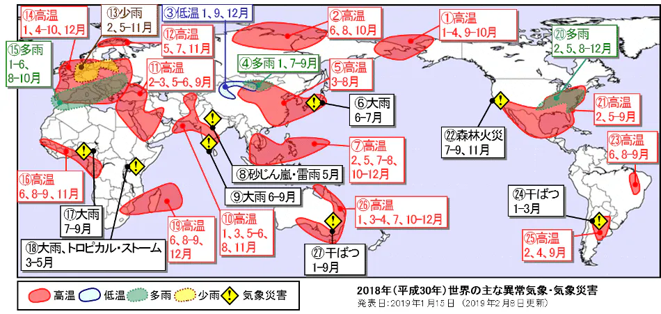 下図は2018年に世界で起こった異常気象の数々を分布としてまとめたものです。(出典:気象庁HP)